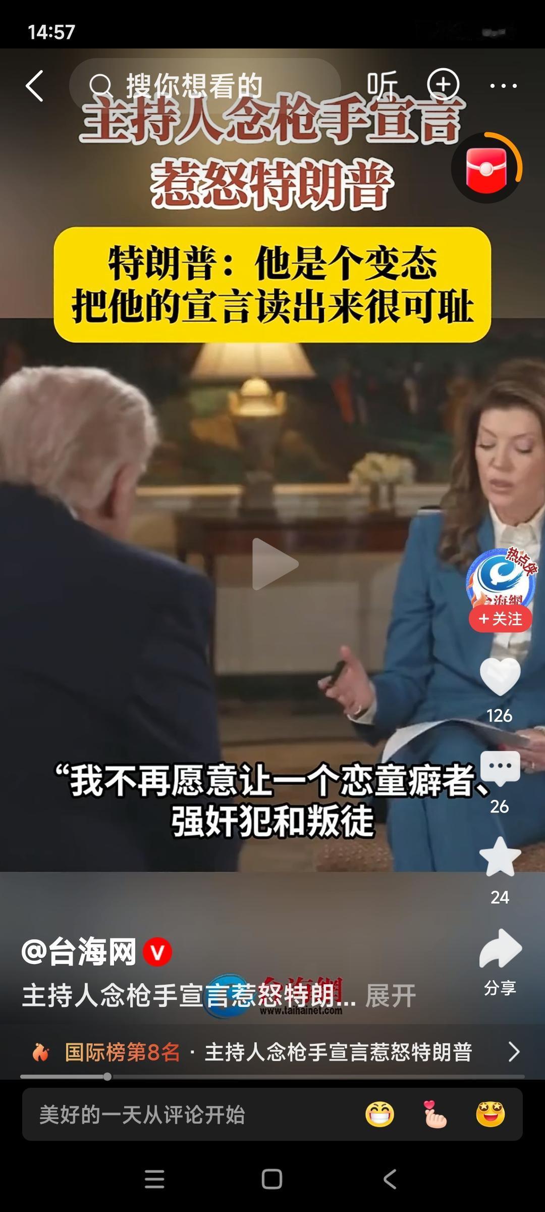 白宫宴会刺杀案的犯罪嫌疑人的宣言称:这次,刺杀的目标是美国官员,我不愿意让一个恋童癖者、强奸犯和叛徒的罪行沾满自己的双手! 特朗普:他是疯子,胡言乱语,我不是恋童者,我不是强奸犯。我跟爱泼斯坦无任何关系!