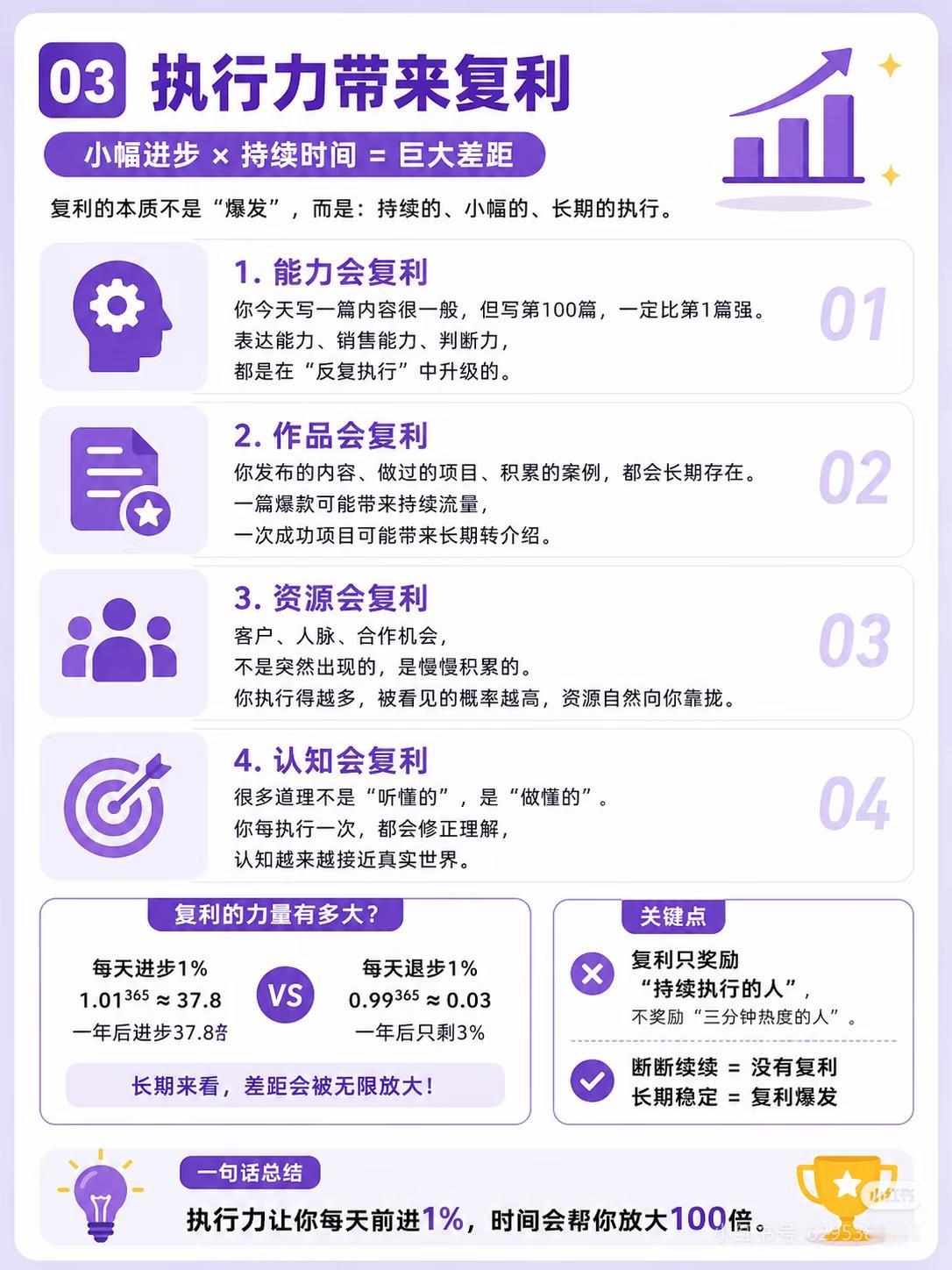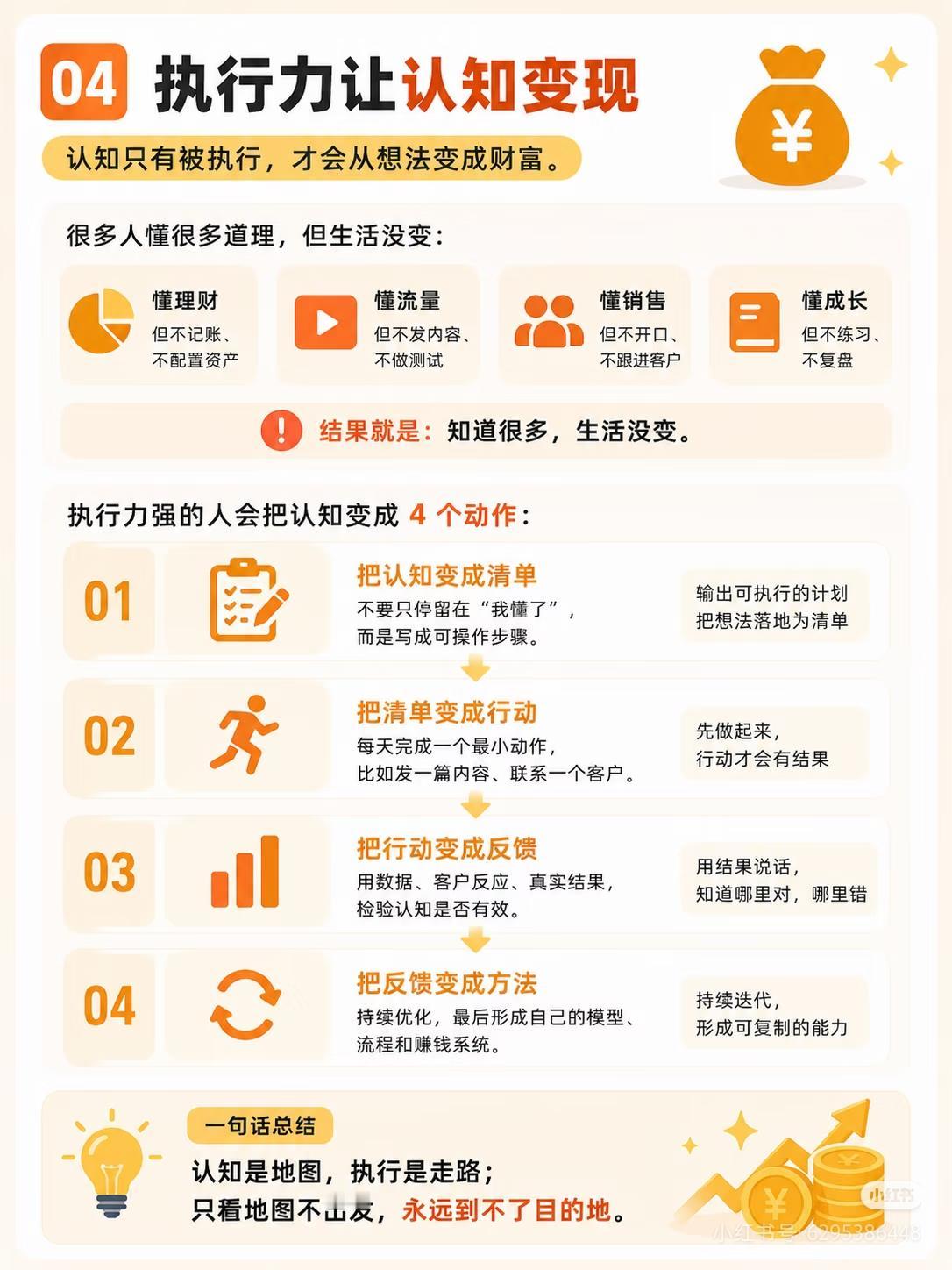 投资里的终极硬通货:执行力 巴菲特说过:“做你害怕做的事,害怕就会消失。” 在投资里,90%的人不是输在认知,而是输在执行力: ✅机会本身不值钱,抓住机会才值钱,别人还在观望,你已经试了一版,就领先了; ✅用行动替代焦虑,不纠结赛道,先做最小动作,结果会告诉你方向对不对; ✅每天进步1%,时间会帮你放大100倍,长期稳定的执行才是复利的核心; ✅认知是地图,执行才是走路,只看地图不出发,永远到不了目的地; ✅大多数人会在半路放弃,能长期执行的人,自然更容易拿到财富。 执行力本身就是财富,它决定了你能不能把信息、机会、认知,真正变成钱。 你觉得自己投资里最大的卡点,是认知还是执行力?评论区聊聊,收藏转发,一起把认知变成收益! ⚠️风险提示:本文仅为投资理念分享,不构成任何投资建议,股市有风险,投资需谨慎。