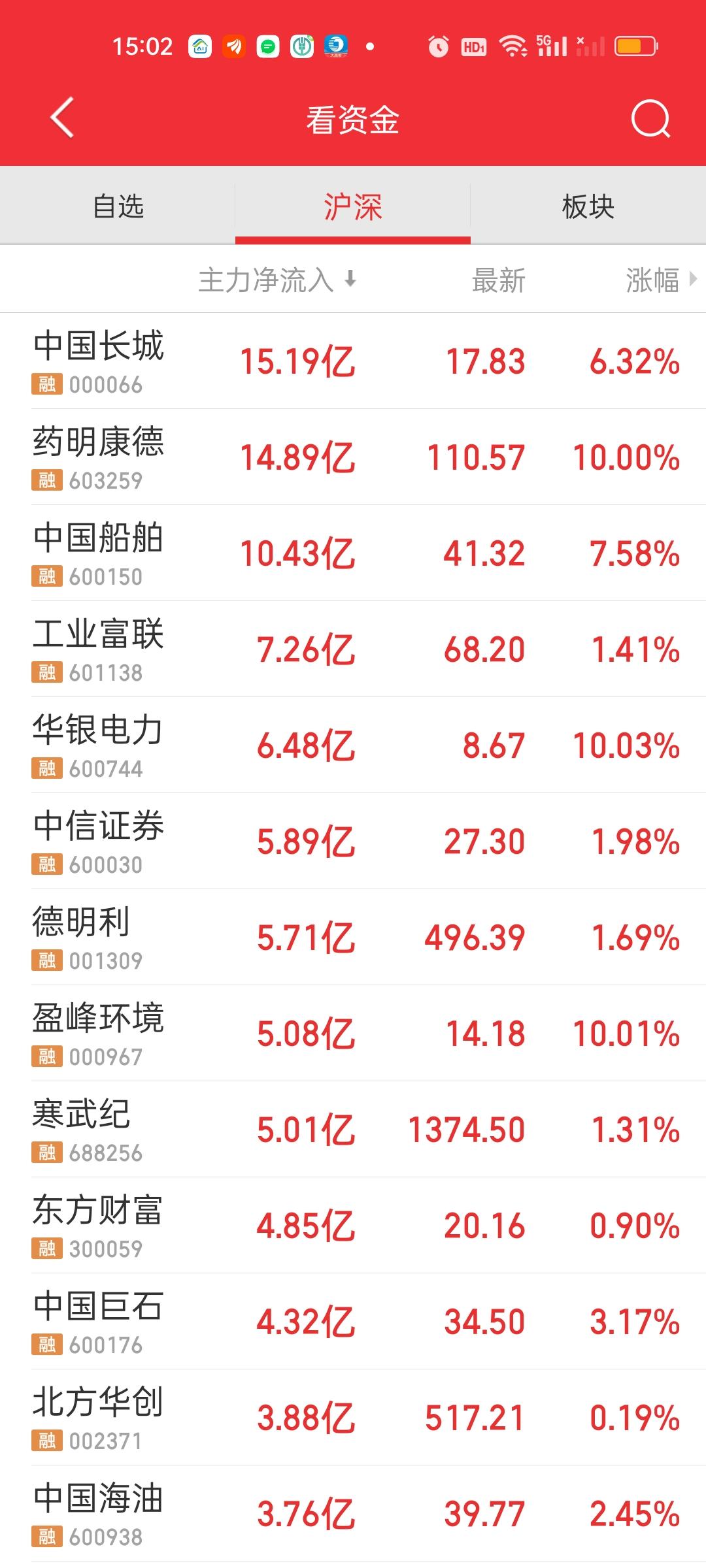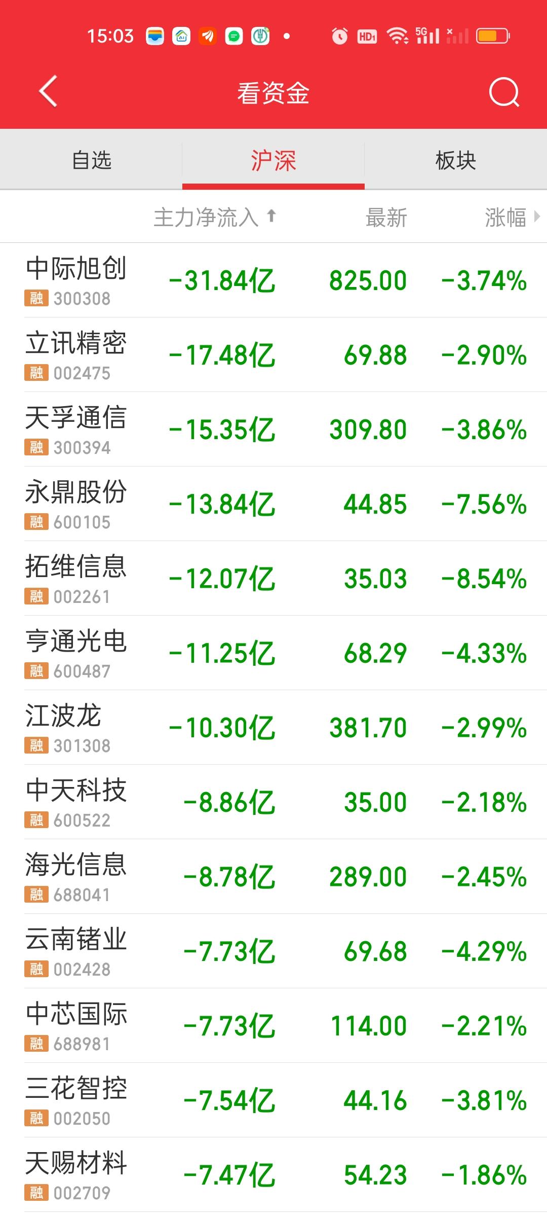 从上午收盘和全天收盘对比来看。成交量变化不大,但大盘资金在加速流出。上午收盘只流出562亿,全天收盘净流出了922亿,这说明下午流出了922-562=360亿。下跌家数3700家左右,和上午大致相当。跌停家数上午收盘有41家,全天54家。下午又增加了13家。 主力资金净流入方面。工业富联下午退出,只有中国长城,药明康德,中国船舶净流入资金在10亿以上。主力资金净流出超10亿的个股下午增加了4只,永鼎股份,拓维信息,亨通光电,江波龙。