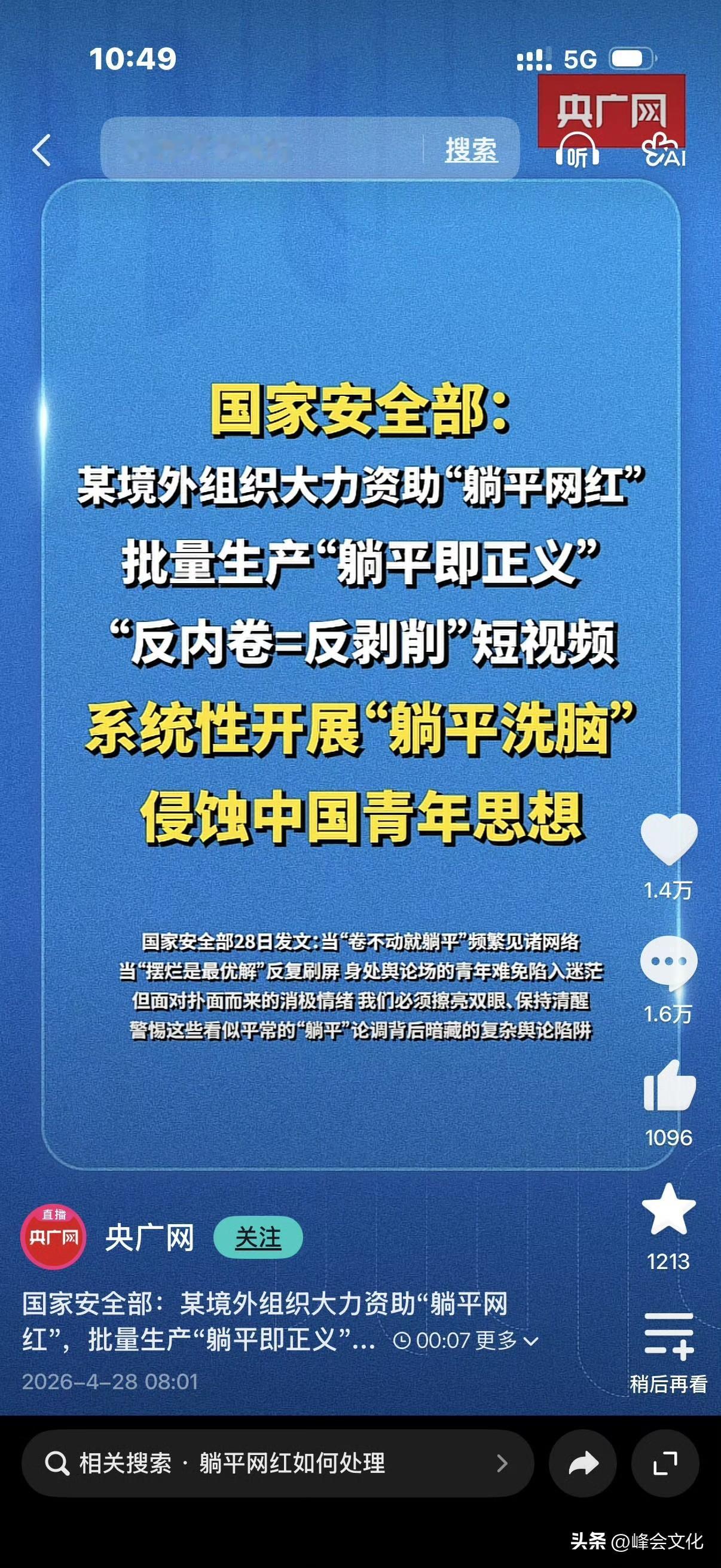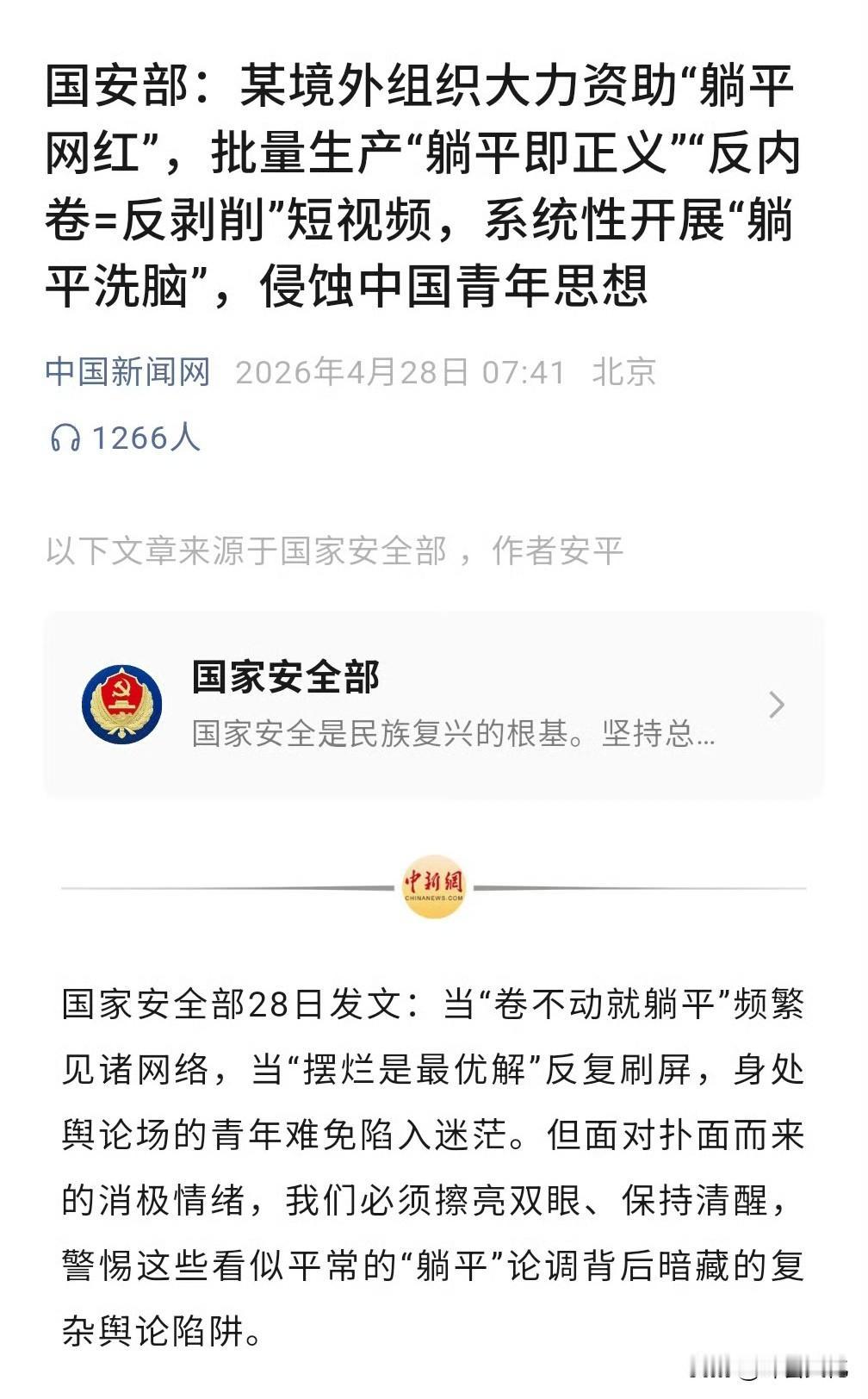 终于开始清扫这种思想的流毒和深挖背后的阴谋了。 当年出现这种思想时,就觉得特别奇怪,怎么突然就冒出了这种思潮,而且专门针对年轻人。 这个舆论,其实已经对我们社会产生了危害,影响了不少年轻人的心态,躺平和享受自己成了很多年轻人的口头禅和生活状态。 之前听过一个年轻人这样说自己准备怎样过一生:自己年轻时就啃老,父母和爷爷奶奶外公外婆可以供着他,等到结婚生孩子以后,父母依然在工作,可以帮他养大孩子;等父母老了,孩子也大了,孩子就可以接着供养他,自己这辈子就为自己活着,逍遥快活就可以。 想想多可怕,年轻人是社会的生力军,也是社会的未来,这种思潮一旦成型,社会将彻底散失发展的动力。 这个社会,一定要鼓励的是年轻人积极向上,靠自己的努力安生立命。普通人能养活自己和自己的家庭,有才华的人,在养活自己和家庭外,可以为社会及国家做出自己的贡献。 年轻人是早上八九点钟的太阳,不管怎样,都要有属于年年轻人特有的朝气。