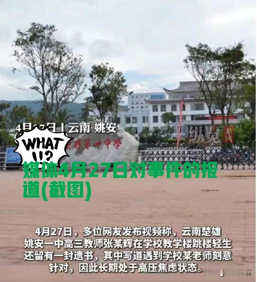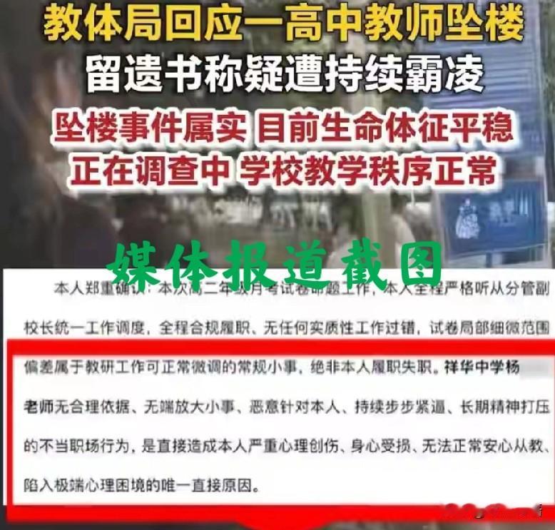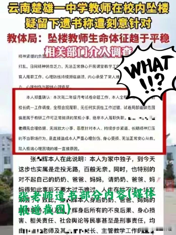 由“教师遭遇职场霸凌跳楼自尽”说起 这是一个让人痛心的事件: 2026年4月27日18时许,云南楚雄姚安一中高三思政课教师张✘✘,从校内(四楼小办公室)下楼自尽。 万幸,张老师坠楼后被紧急送医救治。 目前,命是保住了,但是,张老师情况还不稳定。 据悉,张老师跳楼前,曾留下一封遗书:《告同仁书》。 在遗书里,张老师点了同事杨某某及几位校领导的名字,说明自己寻短见是长期遭受这些人的霸凌所致。 4月27日,这件事上了热搜,引发社会广泛关注。 目前,公安和纪检已介入调查,当地教育局也证实,这件事是问。 但是,目前,当地教育局还没有说明下一步怎么处理…… @红尘禅语 看到这样的案例,很心疼!那是一个年轻老师,也是别人家的孩子! 工作兢兢业业,在学校却被一位同行以及几位领导集体霸凌,选择跳楼自尽。 最扎心的是,笔者看到新闻中提到: 张老师还曾经被那个杨某某当着全班同学的面扇嘴巴子。 据知情人透露,那个当众掌掴张老师的杨某某,是学校科研骨干,平时对同事、对学生甚至对家长说话都很难听。 那次张老师被当着全班同学面掌掴时,班级里看到张老师被杨某某掌掴的学生们,主动站出来,想帮张老师讨回公道。 可是,校方(领导)却装聋作哑,不处理,不作为。 张老师长期遭受职场霸凌,估计也是心理上出了问题,所以,选择了轻生。 【点评】 这样的案例,让人痛心!令人惋惜,也让人有种快要窒息的感觉。 这样的学校,会教出什么样的孩子?细思极恐! 看到媒体有这样的描述: 这位张老师按大纲要求,完成高二月考试卷,却被杨某某以“范围不符”为由,删除微信,踢出教研组群,并公开追责。 呼吁联合调查组张老师遗书控诉内容做好核实,及时公布调查结果,依法依规处理,不要袒护包庇施暴者。 呼吁: 1.如果张老师遗书中控诉内容属实,涉事人员该免职的免职,该调离一线教学岗位的,调离教学岗位! 2.这样的职场霸凌者,目无法纪,目中无人,道德败坏。 如此失德的人员,不配为人师。如果牵涉刑事诉讼及处罚,呼吁开除公职! 3.青少年心理健康教育已引起重视,也请教育行政部门多关注教师身心健康,关注和及时处理教师被职场霸凌。 (本文信息来源: 央广网《官方通报“云南楚雄一中学教师校内跳楼轻生”当事人被及时送医已脱离生命危险》)
