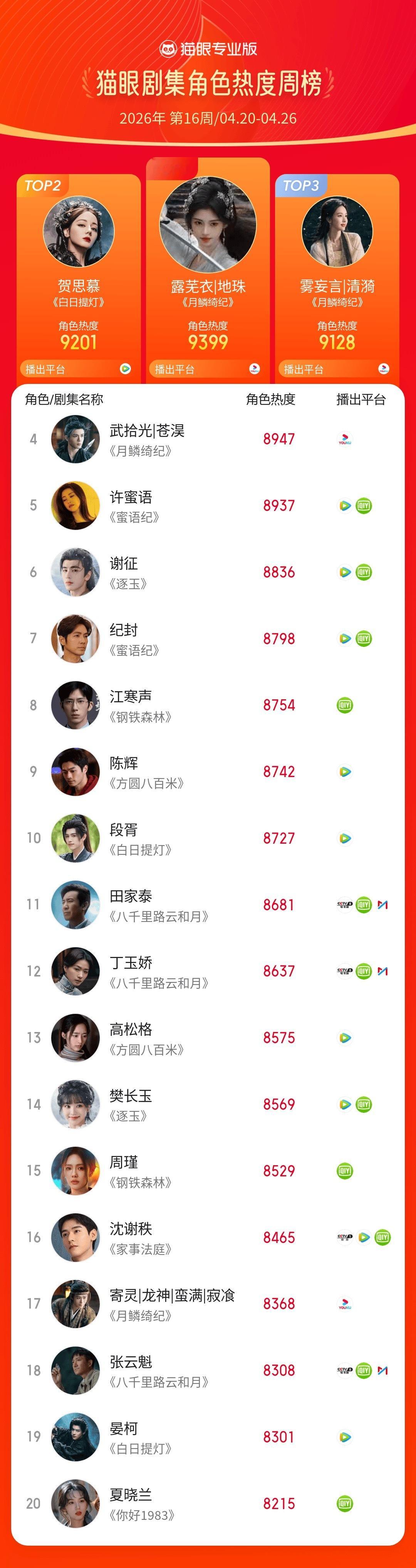 2026第16周猫眼角色热度榜猫眼专业版2026年第16周猫眼角色热度周榜TOP20🏅在《月鳞绮纪》中饰演的“露芜衣/地珠”登顶角色热度榜 鞠婧祎露芜衣角色热度冠军霸榜三周🥈在《白日提灯》中饰演的“贺思慕”位列第二 🥉在《月鳞绮纪》中饰演的“雾妄言/清漪”位列第三