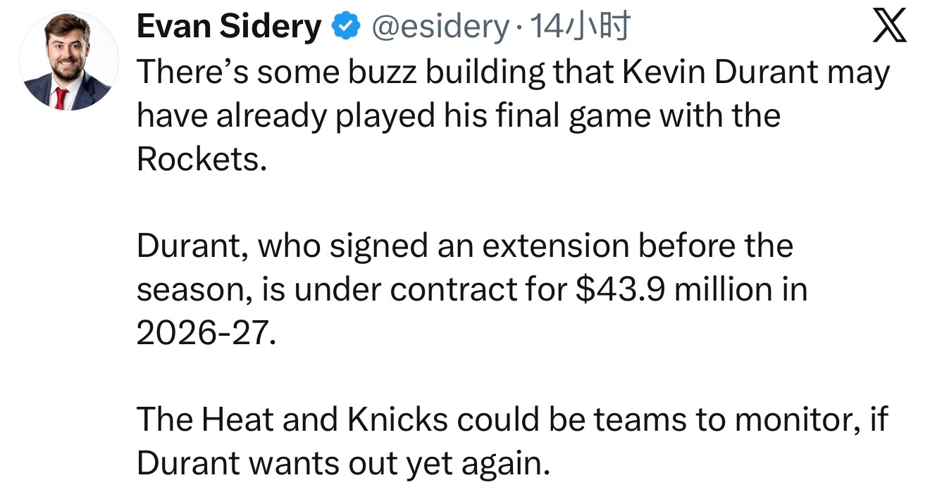 Evan Sidery:有传言称,杜兰特可能已经打完了他在火箭队的最后一场比赛。