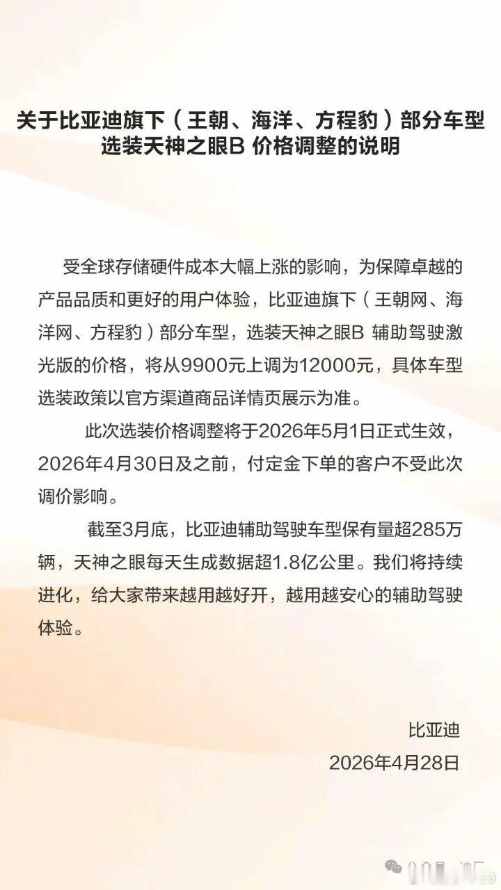 比亚迪旗下(王朝网、海洋网、方程豹)部分车型,选装天神之眼B 辅助驾驶激光版的价格,将从9900元上调为12000元