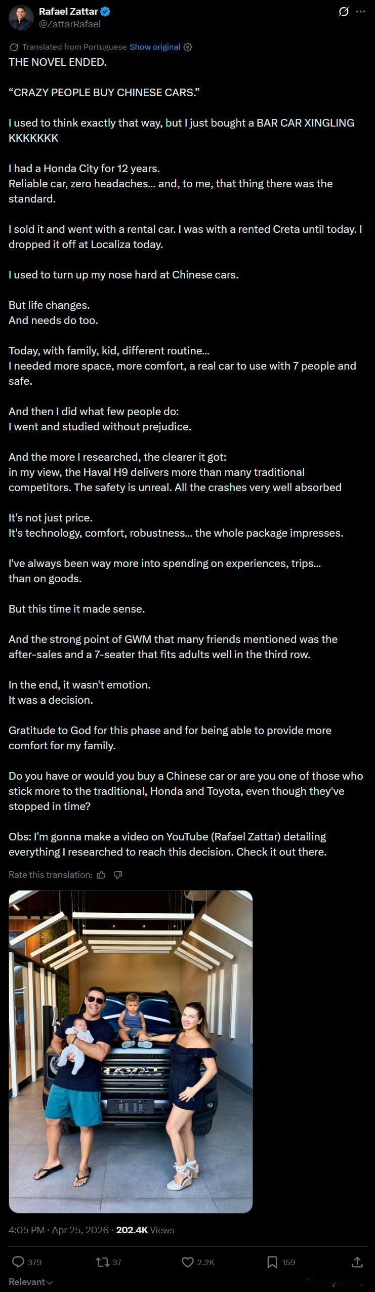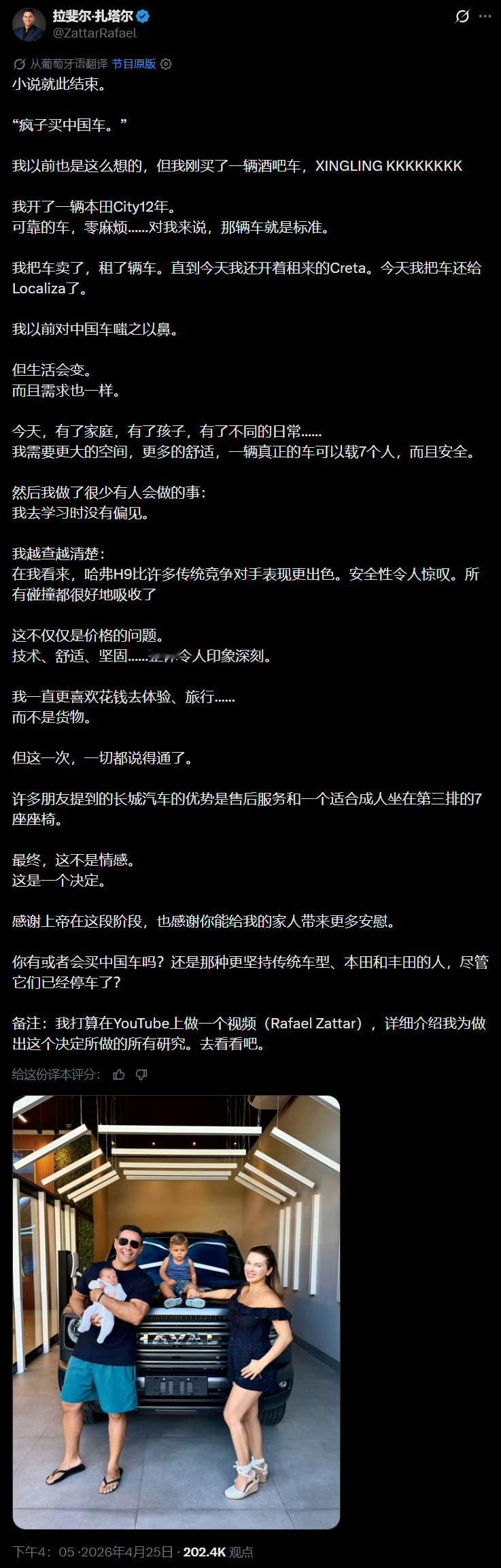 下图是巴西知名财经博主Rafael Zattar自己写的亲身经历:他以前一直各种瞧不上中国车,觉得“只有疯子才会买中国车”。他自己开了12年的车是Honda,从来不考虑其他品牌,对中国车更是直接鼻子朝天。现在家里添了孩子,需要一台真正能坐7个成年人的大空间SUV。好在他放下偏见重新研究了自己的需求和当下的车市,直接下手买了哈弗H9,现在真香了。他还准备开视频专题介绍自己的真香系列。