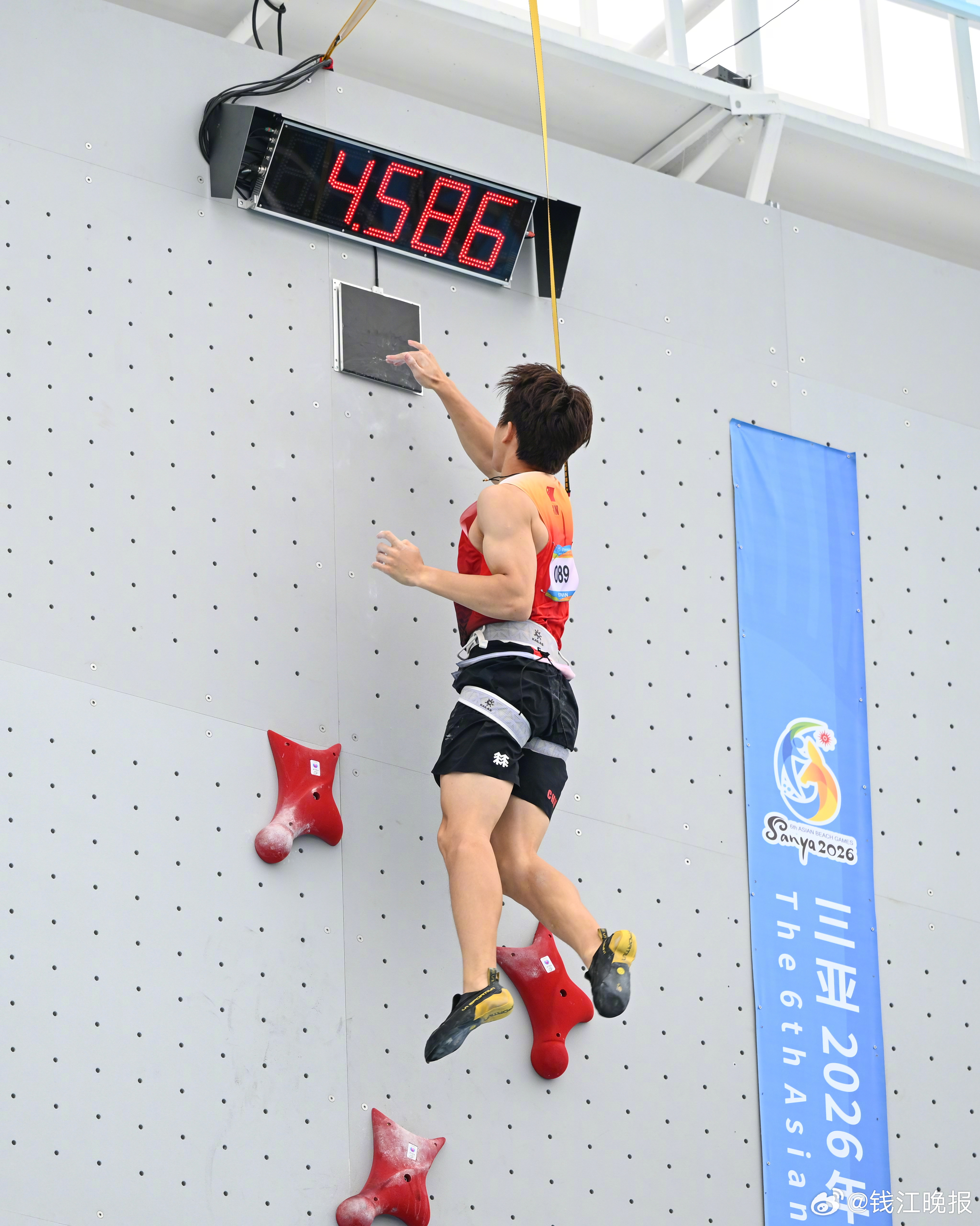 4月28日,在海南三亚进行的第六届亚洲沙滩运动会攀岩速度男子预赛中,中国选手赵一程以4秒58的成绩创造该项目世界纪录,并晋级八分之一决赛。原纪录是由美国选手沃森在2025年攀岩世界杯巴厘岛站中创造的4秒64。#亚沙会三亚时刻##跟着亚沙游海南# (图文来源:第六届亚洲沙滩运动会组委会)