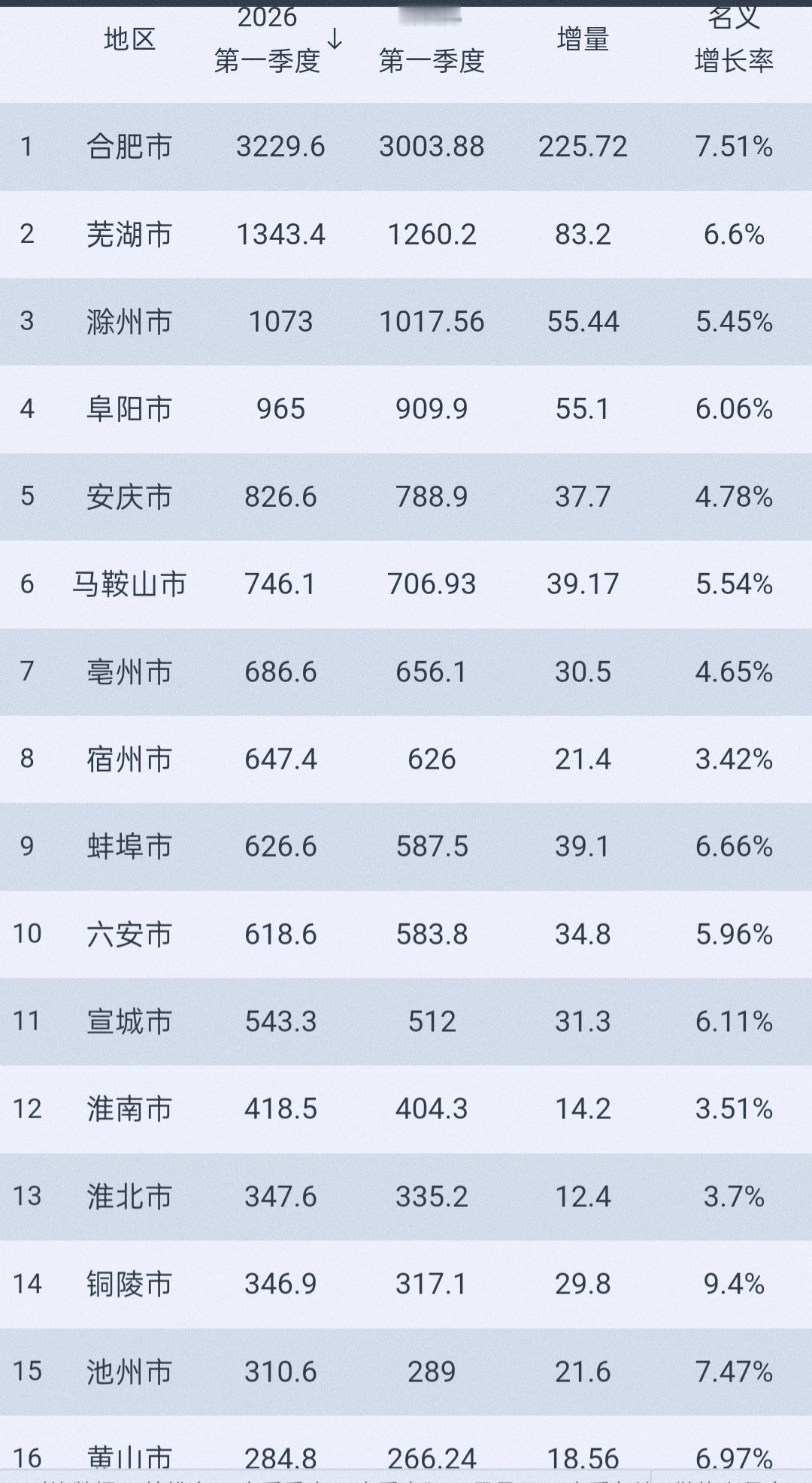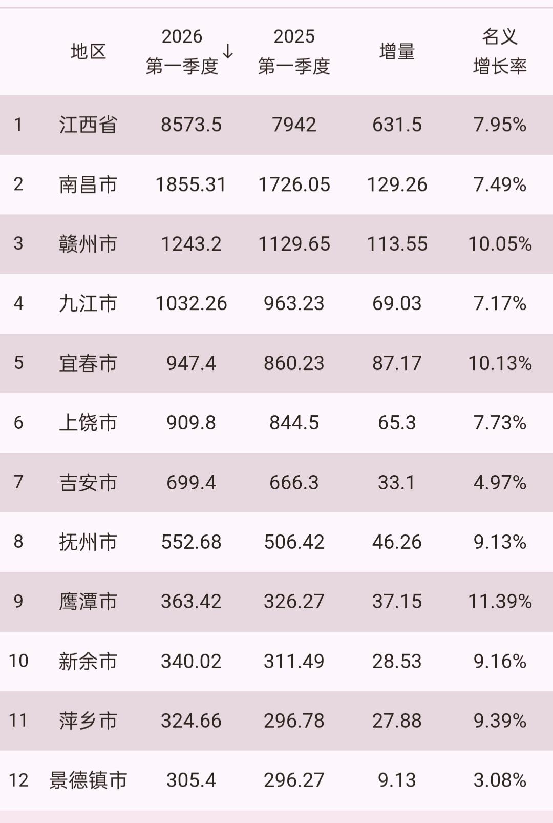 赣州挺猛,但和芜湖还差100亿。滁州比九江多40亿、阜阳比宜春多18亿、上饶比安庆多70亿。 差距比较大的是南昌少合肥1300多亿,等于是少了一个赣州。