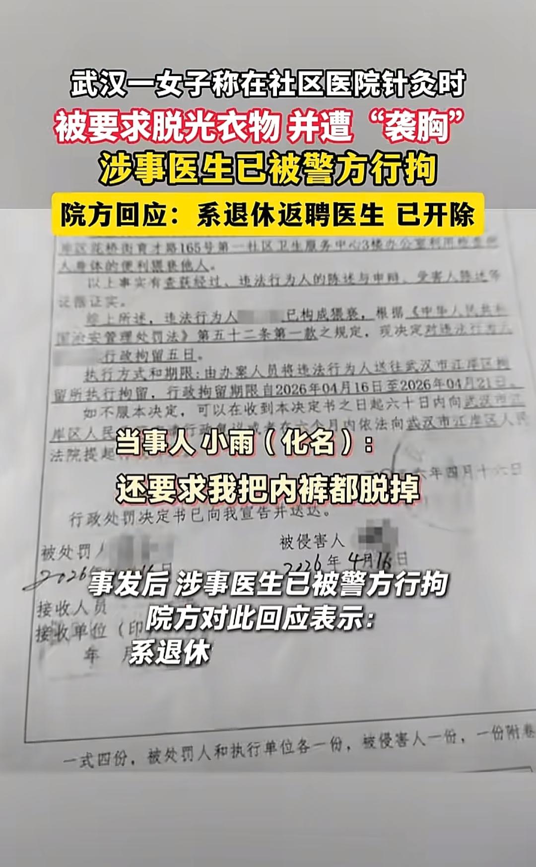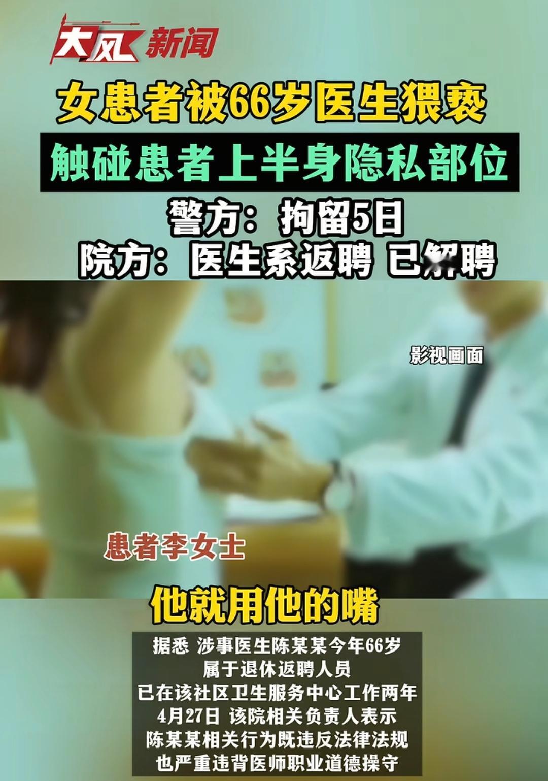 66岁退休返聘医生,看女患者有几分姿色,借着检查脊椎的名义让人脱光衣服,之后从背后袭胸猥亵!警方:行拘5日。网友骂翻:一把年纪管不住自己,为老不尊,这下子女儿孙子的脸都被丢尽了! 在社区卫生服务中心,66岁的陈某某算是块活招牌。诊室墙上挂着好几面锦旗,什么“妙手回春”“医德高尚”,红底金字亮堂堂的。退休返聘、疼痛康复科干了40多年,老病人一提起他都竖大拇指,说他手法好、经验足。 可谁能想到,这个穿着白大褂、头发花白的老专家,会干出让人头皮发麻的事。 4月16号,一名女子因为颈椎不舒服挂了陈某某的号。先是正常的针灸、按摩、牵引,流程跟平时没什么两样,女子心里还觉得这医生挺负责。 结果常规治疗一结束,陈某某突然说还得加一个专项检查,把她领到单独的一间诊室。 门一关,陈某某张口就让该女子把全身衣服都脱掉。 女子一下子愣住了。治颈椎为什么要脱光?她试探着问了一句,可陈某某立马用那种不容置疑的口气怼回来:“我在检查脊椎和脊根,你都结婚的人了,还害羞什么?” 这句话把她噎得脸通红,心里虽然觉得不对劲,可又怕是自己想多了、小题大做。犹豫了几秒,她还是硬着头皮照做了。 检查倒是正常做完了。可就在她背过身穿衣服的那一刻,陈某某盯着她背影,动了邪念。他突然从后面冲上去,一把抱住该女子,手直接往她胸口抓。 女子吓得脑子一片空白,慌慌张张套上衣服就往诊室外面冲。回了家,眼泪止不住地流,把事情一五一十告诉了家里人。家人当时就炸了,二话不说直接报警。 警方动作很快,当天就把事情查实了,陈某某被行政拘留5天。医院也连夜发通告,和他解除了聘用关系。 事情被曝光后,网友的愤怒根本压不住。除了骂他老不正经,更让人后背发凉的是另一种声音:他干这行40多年了,这事真就那么巧是头一回?以前那些来看病的女患者,有多少人吃了哑巴亏不敢吱声? 医生这件白大褂,穿上是份职业,脱下是做人的底线。患者走进诊室,是把身体和信任一起交出来的,这份托付有多重,行医的人心里应该比谁都清楚。 5天拘留,罚也罚了;医院解聘,饭碗也丢了。可这事留下的窟窿,远不止这些。他这40年里,是不是真的只走过这一次岔路?