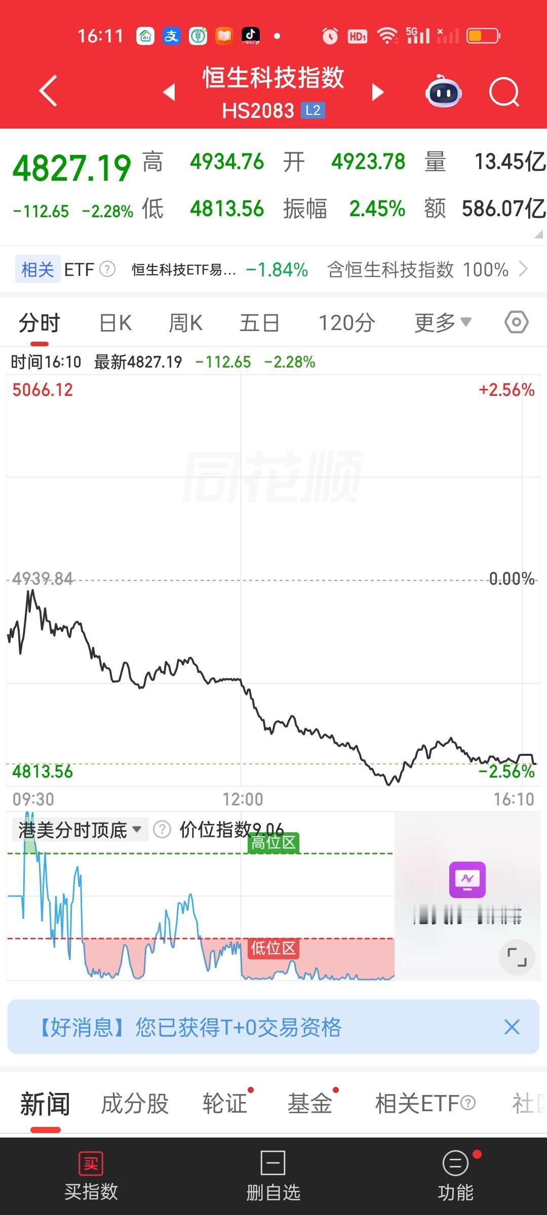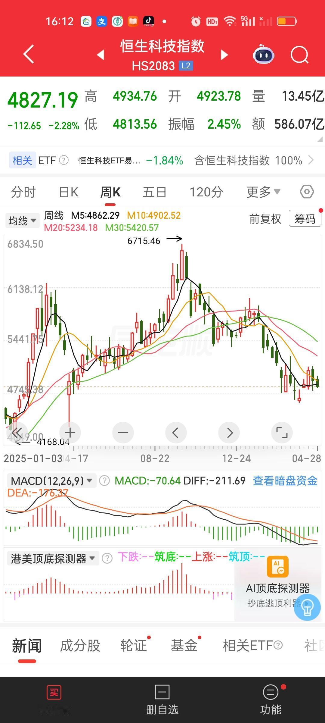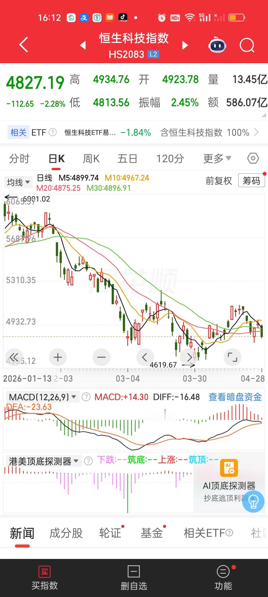 港股收盘了,恒指就剩30日线一道防线了,恒科已经跌破全部均线。不得不说这个走势实在太弱了。晚上再看看美股的情况,这个地方割也没有办法割,涨又涨不了,越来越像鸡肋了。