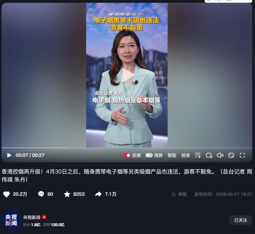 突发!香港4月30日起“最严禁烟令”落地,游客带电子烟不抽也罚3000,最高判半年! 4月30日起,香港控烟条例直接拉满顶配,一句话:带都不能带,不管抽不抽,不管你是本地人还是游客,违规就重罚! 这次管控的是所有另类吸烟产品,包括电子烟、加热烟、草本烟,没有例外。从4月30日开始,在香港公共场所,只要你身上有这些东西,哪怕包装没拆、一口没抽,单纯随身携带,直接定性违法。 处罚标准分两档,持有少量,也就是不超过5个烟弹、5毫升烟油、100支加热烟或100卷草本烟,直接定额罚款3000港元,折合人民币快2700元。只要超了这个数量,直接刑事检控,最高罚款5万港元,还得监禁6个月,没有商量余地。 最关键的一点,游客绝对没有豁免权,这是铁律,别拿“我是游客不知道”当借口,在香港法律面前,本地人和外来访客一视同仁。 最近已经有不少内地游客踩坑,包里放了个闲置电子烟,没拿出来过,过关安检直接查到,当场开罚单,一分不少交,别觉得是个案,接下来执法只会更严。 香港这次是动真格,不是做做样子,背后是多年控烟布局的终极收网,目标就是彻底掐死新型烟草在香港的生存空间。 很多人纳闷,香港为啥对这些烟赶尽杀绝?别以为是小题大做,本质是精准打击新型烟草的危害,尤其是保护年轻人。 电子烟、加热烟这些东西,披着“无害”“辅助戒烟”的外衣,实际危害一点不小,还容易诱导青少年尝试,一旦沾上,大概率会转成传统烟民,这是香港绝对不能容忍的。 香港的控烟逻辑一直很清晰,2022年就已经禁止另类吸烟产品的进口、销售和推广,之前留了个“个人持有不违法”的口子,导致私下流通泛滥,不少人偷偷带、私下卖,尤其对青少年渗透严重。 这次新规补上最后漏洞,从“禁止卖”升级到“禁止带”,直接斩断存量流通,形成从市场到个人口袋的全链条封锁,彻底杜绝灰色地带。 再看执法力度,香港这次是全方位加码,没有任何模糊空间。禁烟范围早就扩到极致,学校、医院、幼儿中心出入口3米内,排队区域、巴士站、餐厅门口,全是禁烟区,只要有人的公共区域,基本都不能碰这些烟。 执法零容忍,1000多名控烟督察全员上岗,搭配AI筛查,识别率高达90%,发现违规直接开罚,15分钟就能走完处罚流程,不警告、不劝阻,没有人情可讲。 更狠的是,逾期不交罚款后果严重,税务局会直接追债,影响个人征信,银行贷款利息上浮,甚至离境时会被拦截,补齐罚款才能走,别想着赖掉。 有人说,香港管得太宽,太不近人情。这话大错特错,严格背后全是民生温度。香港的公共健康治理,从来都是把公众利益放在第一位,二手烟、三手烟危害,不用多说,尤其是老人、小孩、孕妇,根本没地方躲。 香港的目标很明确,把吸烟率从9%压到7.8%,这样每年能省下80亿港元的医疗开支,这些钱能投入到民生福利、医疗保障上,最终惠及的是所有人。 对新型烟草的零容忍,本质是守住公共健康底线,不让少数人的不良习惯,损害大多数人的权益,更不让年轻人被烟草毁掉未来。 很多内地游客还活在老认知里,觉得只要不在公共场所抽烟,随身携带备用没问题,这个想法现在彻底过时了。两地规则差异巨大,内地对电子烟管控和香港完全不是一个级别,别拿内地习惯套香港法律,到了香港,就得守香港的规矩。 现在距离4月30日只剩几天,所有计划赴港的人,赶紧自查行李,电子烟、加热烟、草本烟,不管是成品、烟弹、烟油,全都别带,别存侥幸心理,3000港元罚款不是小数,更别碰刑事风险,得不偿失。 香港这次控烟升级,给所有城市做了示范,公共健康不是小事,零容忍才能出效果。别觉得这是香港的事,随着大家健康意识提升,未来内地对新型烟草的管控,大概率也会越来越严,这是大趋势,没人能逆转。 对我们普通人来说,远离烟草,不管是传统烟还是新型烟,都是对自己健康负责,也是对他人负责。 最后再重申一遍,4月30日起,香港公共场所,电子烟、加热烟、草本烟,携带即违法,游客无豁免,罚款3000起,最高判半年。转发给身边要去香港的朋友,别让他们莫名其妙挨罚,出门在外,遵守规则,才能顺顺利利!