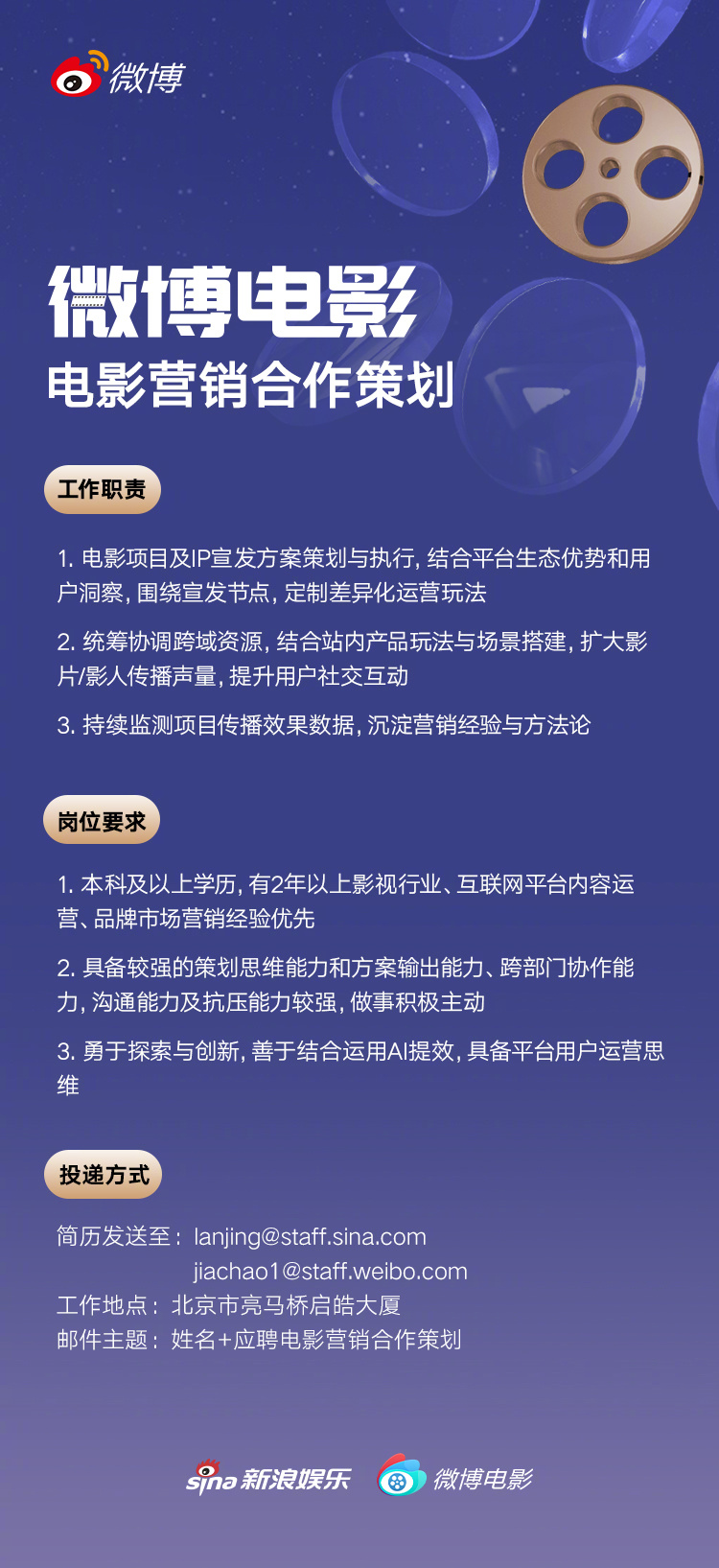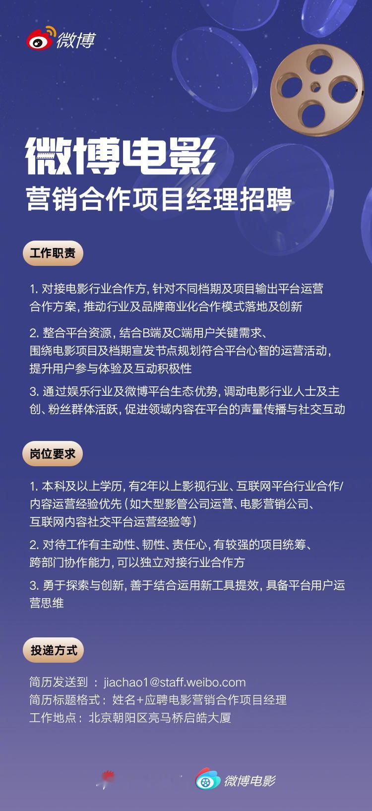 招聘 微博电影最新招聘,岗位如下,详情请参考图片↓