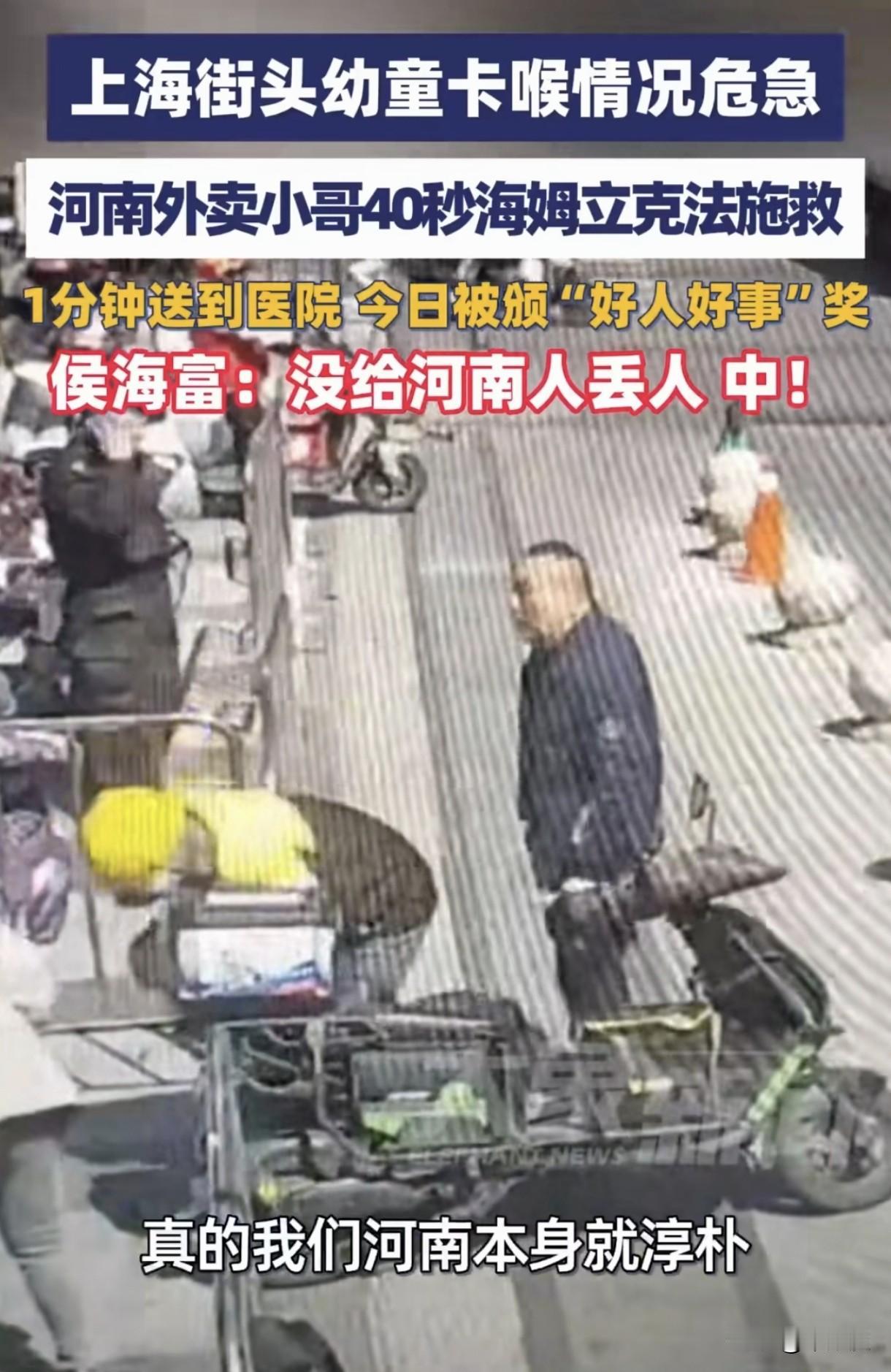 40秒救回幼童!河南外卖小哥侯海富,你太中了! 上海这事儿,看得我热泪盈眶,必须给咱河南小伙侯海富,狠狠点个赞! 什么叫平民英雄?什么叫刻在骨子里的善良?这个骑着电动车的河南外卖小哥,给了所有人最响亮的答案! 事发上海街头,一个幼童突发异物卡喉,小脸憋得发紫,眼看呼吸都要停了,孩子家长急得当场崩溃,哭天抢地却手足无措。 就在这千钧一发、命悬一线的时刻,路过的外卖小哥侯海富,连电动车都没停稳,一把扔下单子,想都没想就冲了上去。 没有半分犹豫,没有一丝迟疑,他一把抱过孩子,上手就是标准的海姆立克急救法,动作干脆利落,每一秒都在和死神抢时间。 仅仅40秒!卡在孩子喉咙里的异物顺利排出,孩子“哇”的一声哭了出来,一条鲜活的小生命,被他从鬼门关硬生生拉了回来! 可侯海富半点没松劲,怕孩子有后续风险,当即让家长抱着孩子坐上自己的电动车,一路疾驰,1分钟就冲到了附近医院,亲眼看着孩子彻底平安无事,他才默默转身,骑上车继续跑自己的外卖,连名字都没留。 后来孩子家人几经辗转找到了他,当地也给他颁发了“好人好事”奖励,面对镜头,这个朴实的河南汉子,红着脸只说了一句让我瞬间破防的话:“没给河南人丢人,中!” 他还笑着说,咱河南人本身就淳朴,遇见这种事,谁都会伸手帮一把。 我看到这儿,心里又暖又酸。 他是谁?他只是个普普通通的外卖员,每天风里来雨里去,穿梭在上海的大街小巷,赚的每一分钱,都是踩着时间点、拼着辛苦熬出来的。 订单超时要扣钱,晚送一步要被投诉,可在人命关天的时刻,他把这些全都抛到了九霄云外。在他眼里,一单外卖的得失,和一条孩子的命比起来,根本不值一提。 更难得的是,他不光有挺身而出的勇气,更有救人于危难的真本事。40秒行云流水的急救操作,背后是他平日里默默学习的善意,是把“救人”两个字,实实在在刻在了心里。 总有那么些人,拿着刻板印象给河南人贴标签,可一次又一次,危难时刻冲在最前面的,总有河南人的身影。 河南暴雨,他们扛着救生艇、拉着物资往最险的地方冲;各地有难,他们开着货车、拉着米面粮油往疫区送;街头有人命悬一线,他们二话不说,伸手就救。 什么叫淳朴?什么叫仗义?什么叫中国人骨子里的温良?这就是!侯海富用最朴实的行动,告诉了所有人,河南人的“中”,从来都不是嘴上说说,是实打实的担当! 平凡的人,做着最伟大的事。 给侯海富点赞!给每一个在危难时刻挺身而出的平凡英雄点赞!善良从来不分地域,英雄从来不问出处,这样的中国人,到哪里都值得我们肃然起敬! 河南外卖小哥40秒救卡喉幼童 为平民英雄点赞