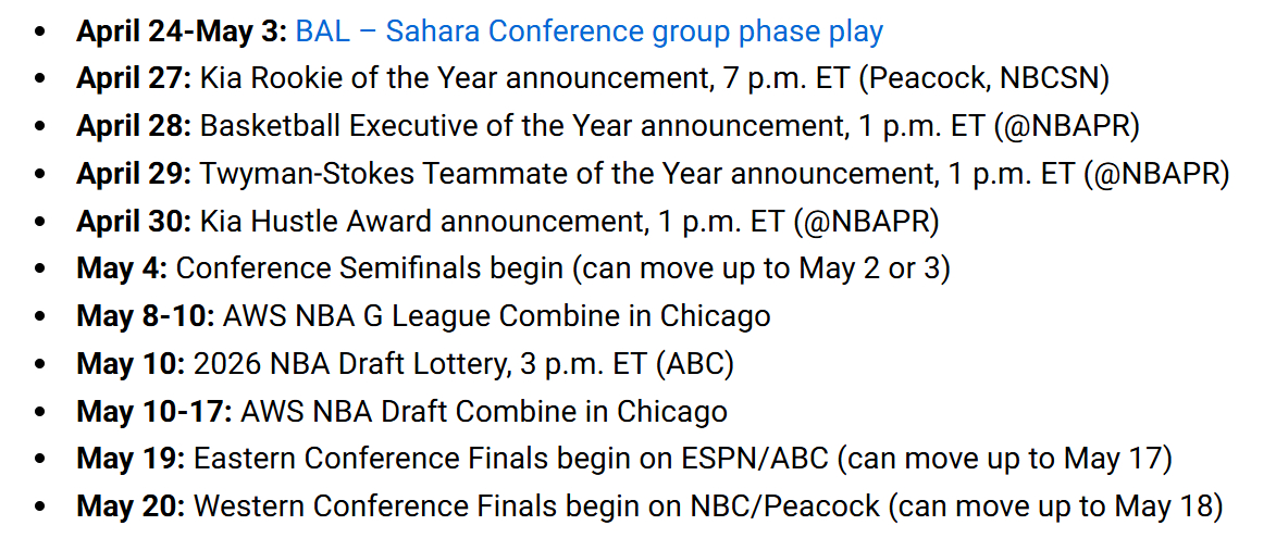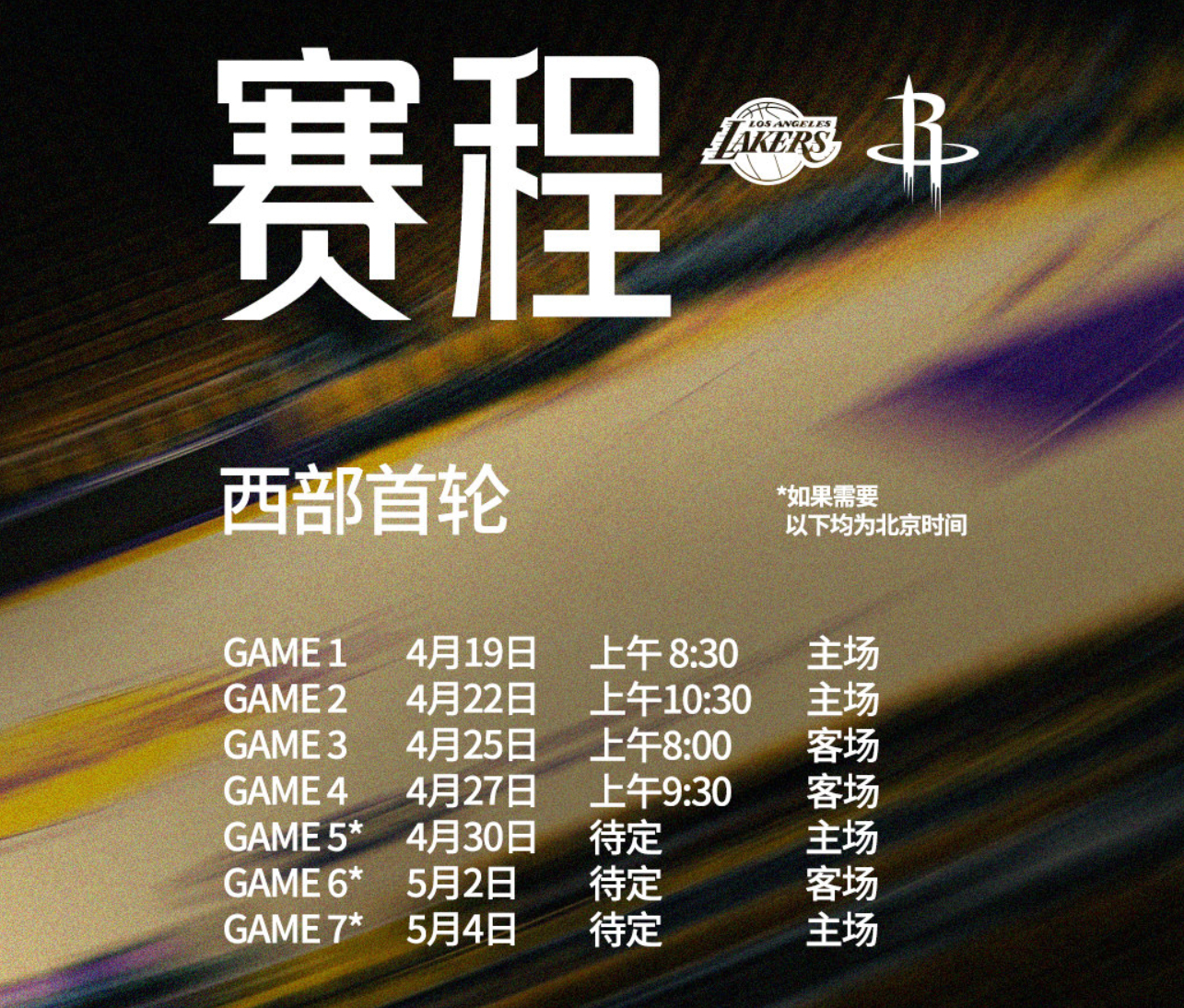 根据官方的时间安排,分区半决赛最早将从北京时间5月3日或者4日开打。如果湖人与火箭的系列赛周四结束,与雷霆的次轮系列赛最早从5月3日开始。如果打到第七场,至少不早于5月6日。