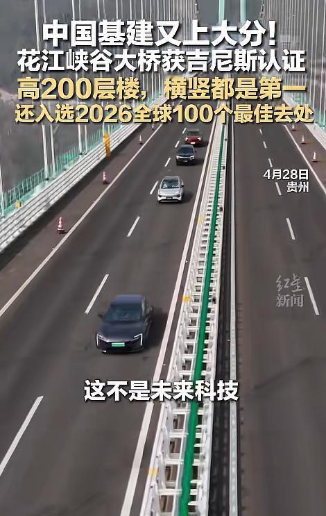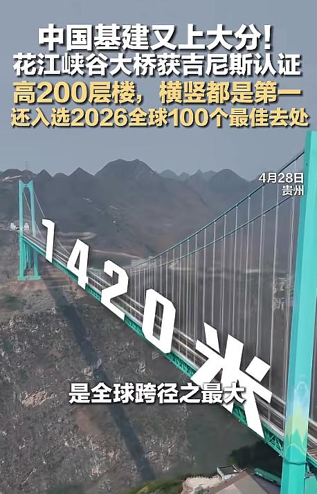 4 月 28 日吉尼斯认证! 贵州花江峡谷大桥以 625 米高度成世界第一高桥,1420 米主跨创山区桥梁跨径纪录,实现 “横竖双第一”。2025 年 9 月通车,将两岸通行从 2 小时缩至 2 分钟,2026 年春节接待 30.1 万人次,入选《时代》杂志全球 100 最佳去处,中国基建再获国际认可! - 在 2026 年 4 月 28 日,贵州花江峡谷大桥正式拿到了吉尼斯认证,它凭借 625 米的高度成了世界第一高桥,这高度相当于 200 多层普通楼房叠在一起,真正刷新了全世界的大桥高度纪录。 这座大桥跨在被称为地球裂缝的峡谷上面,1420 米的主跨径也是山区桥梁里的世界第一,大桥全长 2890 米,用了非常牛的钢桁梁悬索结构,在这么险要的地方建成了横竖都是第一的传奇。 施工队在悬崖上装了空中电梯来运材料,还用智能系统盯着桥梁受力情况,保证了干活时的质量和安全,项目从 2022 年 1 月 18 日开始干,花了 3 年多时间终于在深山里把桥给修通了。 大桥在 2025 年 9 月 28 日正式通车,把之前北盘江大桥的纪录给破了,还把世界第一高桥的高度又往上提了 60 米,这不仅是咱基建技术的突破,更是中国实力让世界都服气的生动表现。 以前过这个大峡谷得走 2 小时的盘山路,现在开车过桥只要 2 分钟就到了,这种速度让两地老百姓出门变得特别方便,直接把安顺和黔西南拉得更近了,也让当地的发展节奏变得更快了。 大桥修好后让贵州的高速网更完善了,也让西南大山里能更好地和全国交通大循环连在一起,这对西部大开发和改善老百姓生活意义很大,成了新时代里带大家奔小康和促进经济发展的关键工程。 建设者在修桥时还顺便把旅游给搞起来了,桥上配了观景台和步道这些好玩的地方,从通车到 2026 年 3 月就有 200 万人来打卡,让这座大桥不仅能通车,还成了贵州名气特别大的旅游新景点。 在 2025 年国庆和 2026 年春节的时候,大桥这边全是游客,光旅游收入就过 1 亿元了,有一半多游客都是从外省专门赶过来看大桥的,当时那场面火得不行,单日最高接待量甚至突破了 4 万人次。 这里还办了铁人三项赛和跳伞比赛,吸引了 22 个国家 200 多个运动员来参加,这些刺激的运动让大桥在国际上更有面子了,也给全世界怎么把大工程和旅游结合在一起打了个非常漂亮的样。 大桥在 2026 年 1 月拿了艾蒂亚产业创新奖,4 月还进了时代杂志 2026 全球 100 个最佳去处名单,作为中国唯一入选的基建项目,它用钢铁告诉全世界,咱们中国的基建不仅修得快而且非常有价值。 信息来源: 红星新闻-中国基建又上大分!花江峡谷大桥获吉尼斯认证,高200层楼,横竖都是第一,还入选2026全球100个最佳去处