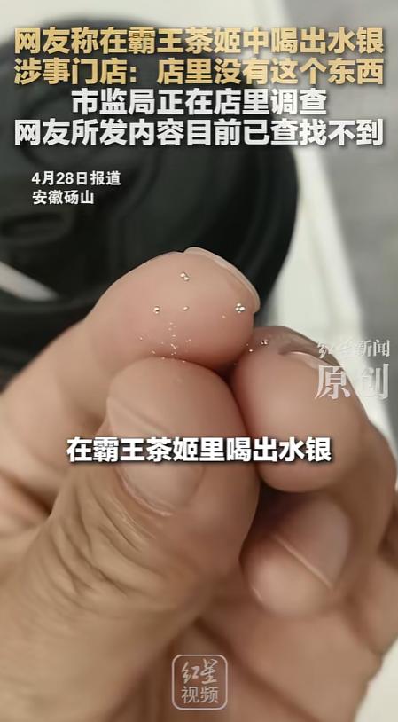 安徽宿州女子 4 月 27 日称在霸王茶姬砀山万达店饮品中喝出疑似水银银色颗粒,感觉冰凉且嚼不烂,门店否认称无接触水银可能,质疑离店后环境不可控。 4 月 28 日市监局局长带队调查,封存原料送检,品牌方表态高度重视。事件冲上热搜,真相待权威检测,你怎么看饮品安全? - 2026 年 4 月 27 日这天,安徽宿州有一位姓王的女士在网上发了一段让人心惊胆战的视频,说她在大名鼎鼎的霸王茶姬店里买的奶茶里居然喝到了亮闪闪的银色小珠子。 这消息一出来就跟炸了锅似的,相关的话题很快就冲到了热搜榜的前几名,弄得大伙儿现在买杯奶茶喝都得先仔仔细细地瞅上半天,生怕自己也遇到这种离谱的安全隐患。 根据这位王女士给媒体讲的详细经过,她在 2026 年 4 月 27 日下午买完奶茶后就直接拎回家喝了,结果喝着喝着就觉得嘴里有几个硬邦邦的小颗粒怎么嚼也嚼不烂。 等她把这些东西吐到手心里一瞧,竟然是几颗跟水银一模一样的圆形小圆珠,摸上去还凉飕飕的,吓得她赶紧拿着这东西跑回店里去质问,并向当地的监管部门直接打了投诉电话。 店里的工作人员在 2026 年 4 月 28 日一早就出面回应了,他们斩钉截铁地说店里绝对不可能出现水银这种毒东西,因为在平时的奶茶制作过程中根本就用不到任何跟汞有关的原料。 店方还委婉地表示这杯奶茶是被顾客带回家之后才发现有问题的,离开柜台后的环境到底发生了啥谁也说不准,所以他们觉得这事儿没准儿是在外头被弄脏的,现在只能等警察来查。 为了把这件事情彻底查个水落石出,霸王茶姬这家分店已经主动报了警,并且把当天所有的监控录像还有没用完的原料全都封起来交给了警察和市场监管部门去检查。 他们还把王女士发现的那些可疑颗粒物也一并送到了专业的检测机构,现在大家都在眼巴巴地等着权威的检测报告出来,看看这些银色的小球到底是个什么鬼东西,好还大家一个明白。 霸王茶姬的总公司在 2026 年 4 月 28 日中午也赶紧出来表了个态,说总部对这起投诉特别重视,已经下了死命令让涉事门店必须无条件配合相关部门的一切调查工作。 品牌方也承诺如果最后查出来真是他们的问题,那该承担的责任他们绝对不会推脱,一切都得看警方和市场监督局最后的调查结果再说,在真相大白之前他们会时刻盯着进展。 2026 年 4 月 28 日上午的时候,砀山县市场监督管理局的局长亲自带队冲到了这家奶茶店里,他们不仅仔细搜查了库房里放原料的地方,还把店里的所有机器设备全都过了一遍筛子。 执法人员还把店里的监控视频仔仔细细地看了好几遍,就是想通过这一帧帧的画面看看制作这杯奶茶的全过程里,到底有没有什么奇怪的动作或者违规的杂物混到杯子里去。 市监局的工作人员跟媒体透了个底,说现在的调查还在紧张地进行当中,因为最终的定性必须得靠实验室里的那些精密仪器测出来的检测报告才算数。 他们现在已经封存了所有的样品,只要检测结果一拿到手就会立刻向全社会公布真相,绝不会让消费者蒙在鼓里,一定会给大家一个明明白白的交代,也让其他奶茶店以此为戒。 挺纳闷的一点是,王女士最开始在网上发的那些视频和内容,在 2026 年 4 月 28 日这天居然莫名其妙地找不着了,很多人都在猜是不是因为压力太大或者别的什么原因被删除了。 网友们在评论区里也是吵得不可开交,有的担心奶茶行业的卫生安全,有的则觉得这事儿疑点挺多,觉得在官方结论出来之前还是别瞎猜,免得让不实的信息到处乱传。 咱们得知道水银这玩意儿可是有剧毒的,万一要是真不小心吃进肚子里或者长时间接触皮肤,那对人的神经系统和肾脏的伤害可大了去了,绝对不是开玩笑的小事。 所以这次的调查结果那是相当的关键,不管是门店监控里的每一个细节,还是原材料的检测数据,都是还原事情真相的唯一救命稻草,必须得拿出实打实的证据才能服众。 到了 2026 年 4 月 28 日下午 16 时的时候,那边的检测工作还在紧锣密鼓地折腾着,目前市面上还没有任何一家权威机构给出最终定论。 大家现在都在耐心地等待着砀山县市场监督管理局的官方通报,希望真相能快点水落石出,让这起闹得沸沸扬扬的霸王茶姬水银事件能有一个公正的结局,别让老百姓喝得提心吊胆。 信息来源: 红星新闻-网友称在霸王茶姬中喝出水银 涉事门店:店里没有这个东西 市监局正在店里调查 网友所发内容目前已查找不到