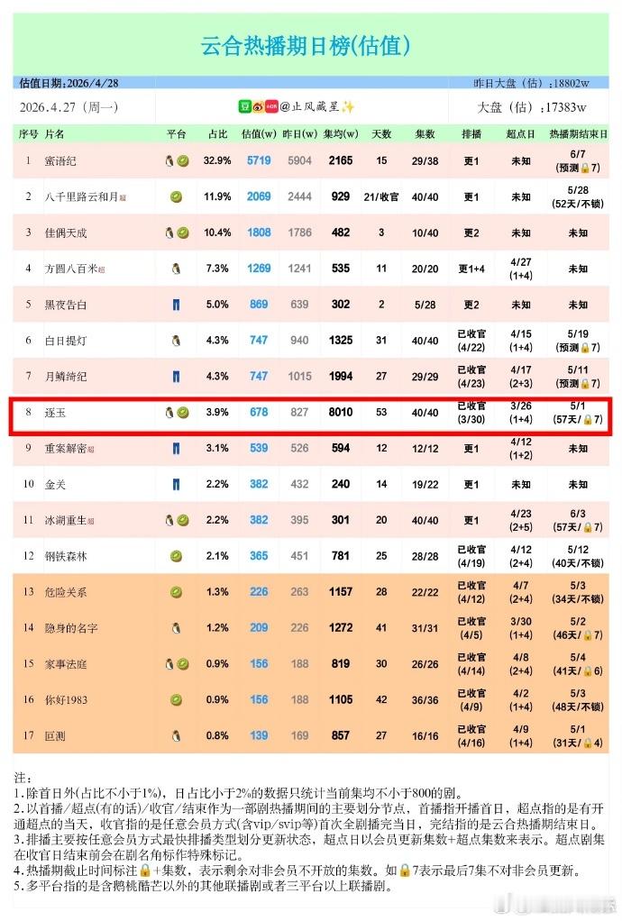 2020年云合改版以来总榜第九!女频史冠!逐玉创造历史,成为第一部进入8000俱