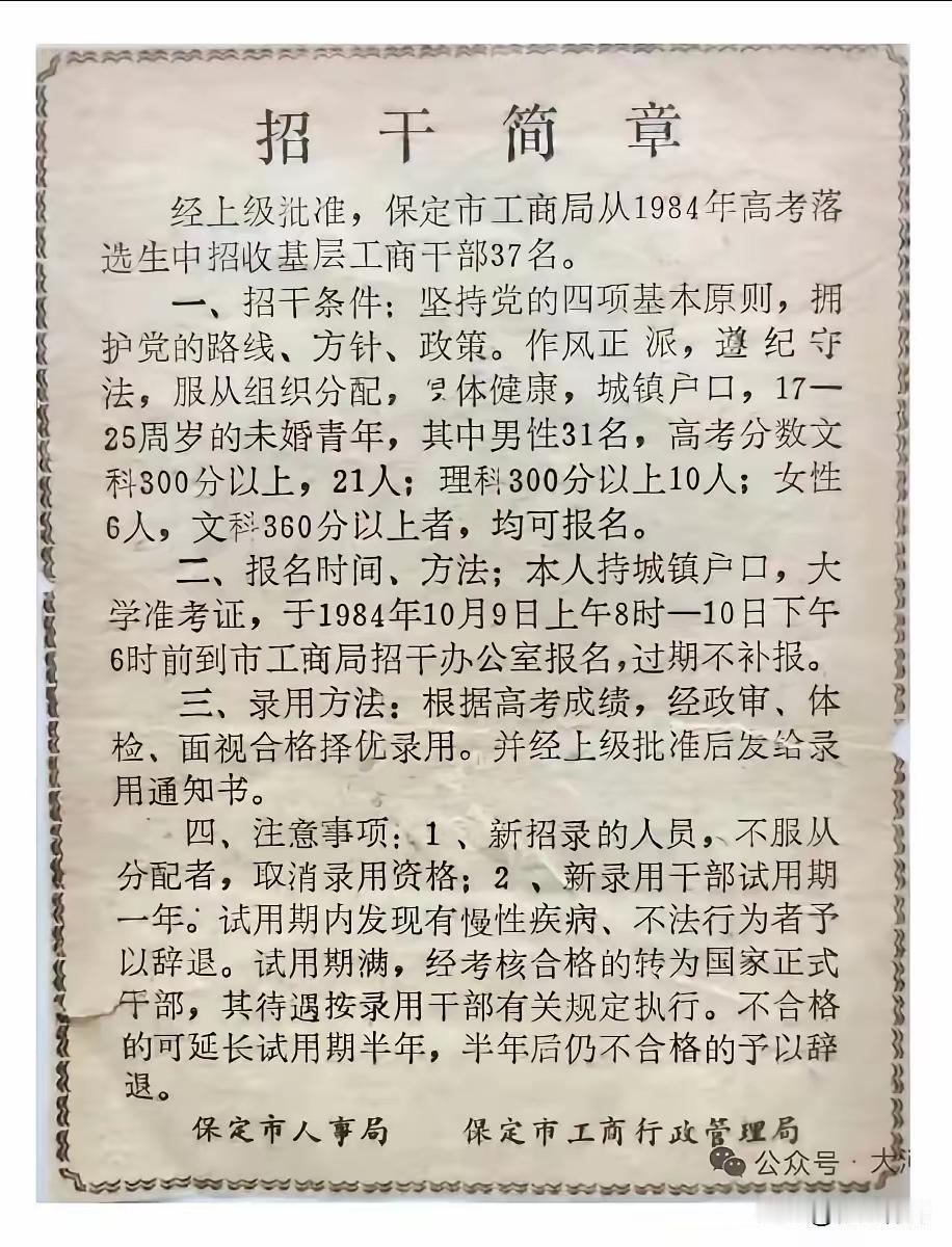 八十年代,小小的招干简章,改变了多少人的命运哈! 自从改革开放以来,咱们国家可以说是进入了新时代,各行各业蓬勃发展,各单位各部门都需要大量新生力量,刚刚恢复的高考制度,毕业生很有限,国家就在高考的落榜生中打开了招干的大门,条件是必须城镇户口,可以说这是给城镇落榜青年最大的福利了! 回过头看,这些落榜青年不乏优秀者,他们如今都到了退休的年龄,有些人还干到副厅级的位置,这就是时代的红利哈!
