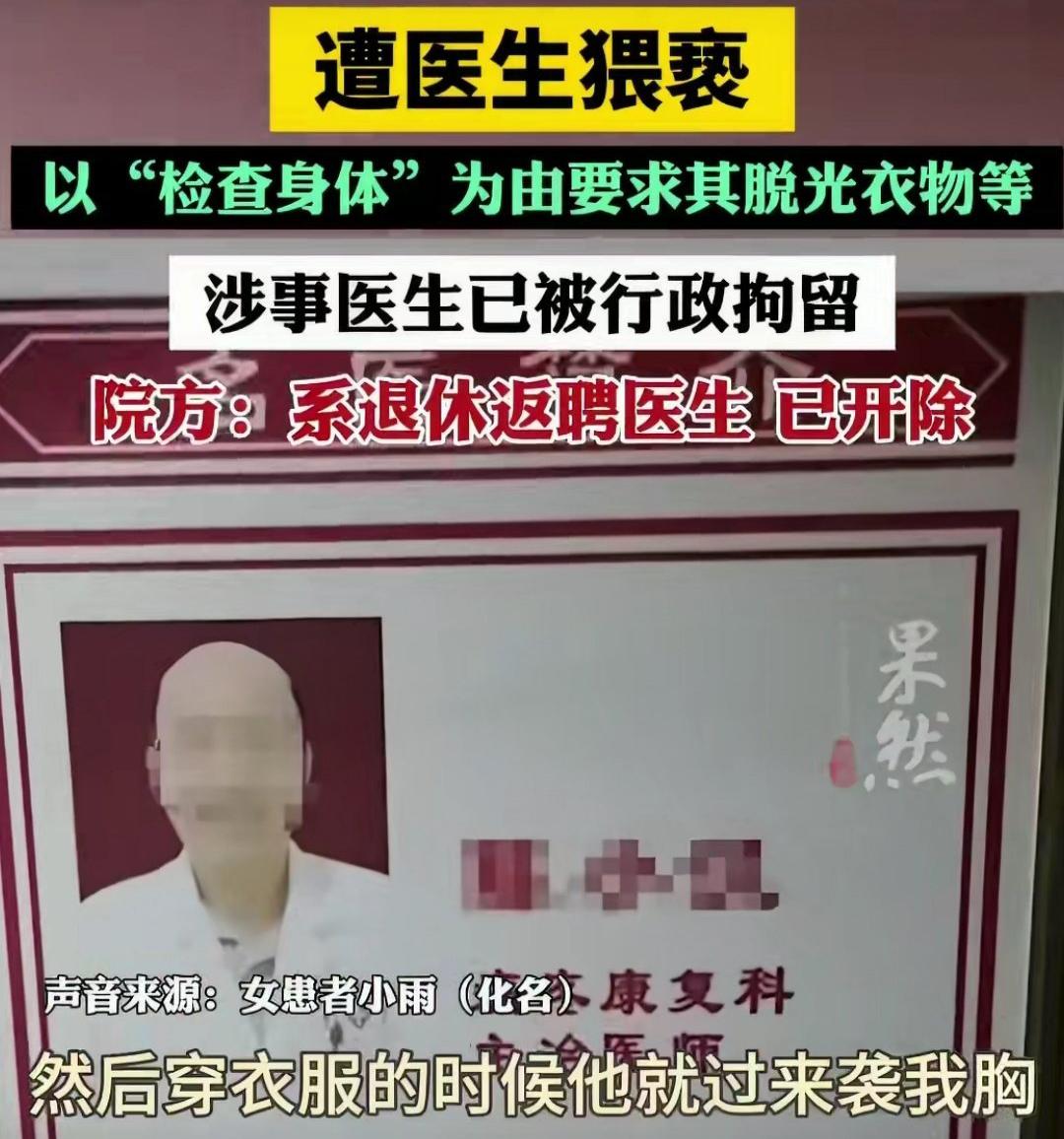 武汉一位女患者的遭遇让很多人脊背发凉。她在社区医院看颈椎病,竟然被一名 66 岁的医生带进单独诊室,要求“脱光衣物”接受检查。受害者当时虽然心存疑虑,但考虑到对方是从事康复科 40 多年的老医生,还是出于对专业的信任配合了。没成想,在检查结束起身穿衣时,这名医生竟然从背后搂抱并实施了袭胸猥亵。事后,警方对其处以行政拘留五日,院方也表示这名医生是退休返聘人员,目前已被开除。 这起事件最让人心寒的地方,在于“信任”被明目张胆地利用了。在患者眼里,白大褂代表的是治病救人的权威和安全感,尤其是一位有着几十年工龄的老医生,谁能想到这身皮囊下藏着一颗龌龊的心?颈椎病检查真的需要全身脱光吗?这种极其拙劣的借口,利用的就是患者在专业知识上的盲区。当一个医生把诊室当成行恶的遮羞布,他猥亵的不只是患者的身体,更是整个医疗行业的公信力。 更让人愤怒的是,这样的恶行竟然只换来五天的行政拘留。对于受害者来说,那几分钟的惊恐和后续的精神创伤,可能需要几年甚至更久去平复。我们常说“医者仁心”,但如果监管不到位、惩戒力度不够,一些害群之马就会觉得犯罪成本太低,从而肆无忌惮。这种事不仅毁了一个人的清白,更让无数女性在以后看病时,不得不提防着那些本该保护她们的人。这种心理阴影,才是最难治愈的。 医院作为管理方,一句“系退休返聘”不该成为挡箭牌。返聘老专家固然是为了利用其经验,但师德和医德的考核绝不能因为“资历深”就打了折扣。保护患者隐私、严格执行诊疗规范,这应该是每一家医院最基本的底线,而不是出事之后才忙着开除。 你觉得这种利用医生身份实施的猥亵行为,仅仅拘留五天够吗?面对类似的“越界”检查,我们到底该如何自保?欢迎在评论区聊聊。 (事件来源:果然新闻)