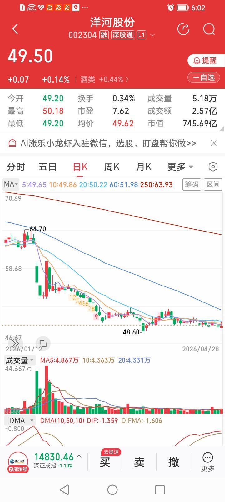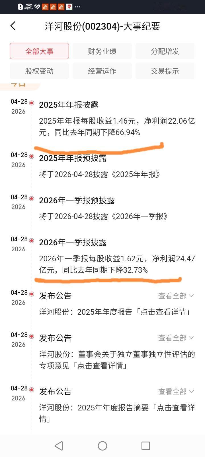 什么情况?惊悚变惊喜?洋河股份业绩大幅下滑,而股价不但没暴雷,还收报了一个红色的春雷。 昨晚洋河股份披露了2025年年报和2026年一季报。归母净利润双双同比下降66.94%和32.73%,下降的幅度不算小。没想到洋河股份今天仅低开0.47%,收盘还上涨了0.14%。算是软着陆了。 市场的心思咱小散的确猜不透,洋河股份今天股价为何能收涨?洋河股份的软着陆是否是白酒股票最坏的时刻已经过去的明确信号?
