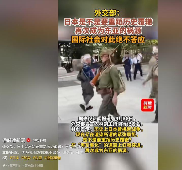 据央视新闻报道,4月28日,外交部发言人林剑在例行记者会上发出严正质问,历史上日本曾挑起战争、侵略他国,现在又在渲染所谓“紧张局势”,是不是要重蹈历史覆辙、在“再军事化”道路上狂飙突进、再次成为东亚“祸源”。 这番话不是空穴来风,而是日本近期一系列危险动作逼出来的警告,每一个关注地区和平的国家和人民都听得清清楚楚。 日本这些年的军事扩张步子越迈越大,已经到了毫不掩饰的地步。2026财年防卫预算突破9万亿日元,创下历史新高,这已经是连续多年大幅增长。 更让人警惕的是,4月21日,日本政府通过内阁决议,完成了对“防卫装备转移三原则”及其运用指南的修改,彻底解禁杀伤性武器出口,原则上允许出口战斗机、导弹等进攻性武器,甚至在特定条件下允许向处于冲突中的国家出口武器。 这一举措彻底打破了日本战后武器出口的禁令壁垒,撕下了“和平国家”的伪装,暴露了其军事扩张的真实野心。 高市早苗政府上台后,日本的再军事化进程更是一路狂飙。海上自卫队裁撤具有防御色彩的“护卫舰队”,新设凸显进攻属性的“水上舰队”;陆上自卫队成立情报作战队;航空自卫队“宇宙作战群”升格为“宇宙作战团”。 日本还开始接收美国制造的“战斧”巡航导弹和挪威制造的联合攻击导弹,并计划部署射程约1000公里的远程导弹,这些都是典型的进攻性武器,完全超出了自卫需求。 更让人无法接受的是,日本在历史问题上始终不老实、不端正。高市早苗接连两天向靖国神社分别供奉祭品和“玉串料”,超百名国会议员集体参拜,这种行为是对历史正义的公然挑衅,是对被侵略国家人民感情的严重伤害。 当年日本军国主义大肆侵略扩张,对中国及亚洲邻国犯下滔天罪行,南京大屠杀、731部队人体实验、强制征召慰安妇等惨案,每一个都记录着日本军国主义的血腥与残暴,这些历史事实铁证如山,不容任何否认和篡改。 日本的这些举动,已经引发国际社会的高度警惕和广泛批评。中俄在涉日问题上立场高度一致,都坚决反对日本加速“再军事化”图谋。 韩国、朝鲜等亚洲邻国也多次对日本的军事动向表达担忧,指出日本的行为正在破坏地区和平稳定。就连日本国内也有不少有识之士站出来,批评高市早苗政府的危险政策,认为这些举动会把日本推向万劫不复的境地。 国际社会绝不答应日本重蹈历史覆辙。《开罗宣言》《波茨坦公告》等国际法律文件明确规定了战后日本的和平发展道路,这些都是国际社会的共同意志,不容日本单方面挑战。 中国外交部已经多次以“三个绝不”作出严正表态,绝不允许日本军国主义死灰复燃,绝不能让历史悲剧再度上演,绝不允许任何人、任何势力破坏和平、为祸地区。 日本那些右翼势力应该清醒认识到,时代已经变了,现在的东亚不是100年前的东亚,现在的中国也不是100年前的中国。 当年日本军国主义的侵略行径,最终以彻底失败告终,给日本人民也带来了巨大痛苦。如今如果执迷不悟,继续在再军事化道路上狂飙突进,只会让日本再次陷入孤立,最终遭到国际社会的共同反对和唾弃。 美国之前一直纵容日本的军事扩张,想把日本打造成遏制中国的棋子,这种做法同样打错了算盘。历史已经证明,养虎为患最终会反噬自身。日本的军国主义基因一旦复活,绝不会只针对中国,美国在亚太的利益也必然受到威胁。 现在的国际社会,已经看清了日本右翼势力的真实面目,接下来在应对策略上必然会有所调整。中国和所有爱好和平的国家必将携手合作,采取必要措施,坚决遏制日本的再军事化进程,维护地区和世界的和平稳定。 日本如果还有一点理智,就应该立即停止错误行径,深刻反省侵略历史,回到和平发展的正确轨道上来,否则等待它的只会是再次失败的命运。