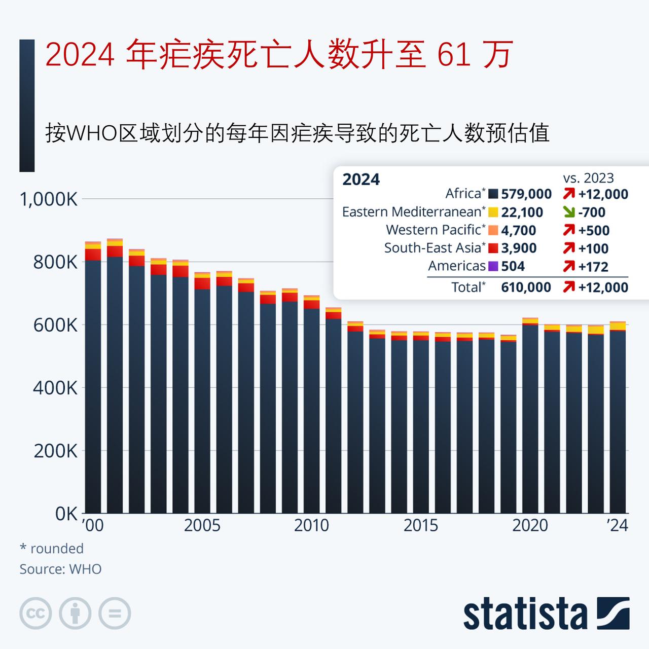 世卫组织通报:2024年全球61万人死于疟疾,死亡人数再度上升 世界卫生组织(WHO)最新数据显示,2024年全球估计有61万人死于疟疾。这一数字远低于2000年记录的86.4万人,这反映出多年来各国坚定的政治承诺和全球投入成效——这些投入扩大了经杀虫剂处理的蚊帐(ITN)、快速诊断检测和青蒿素类复方疗法的可及性。 然而,近年来防控进展陷入停滞。2019年至2020年间,受新冠疫情影响,疟疾防控、诊断和治疗工作受阻,全球疟疾死亡人数激增约5.4万人。尽管此后出现部分复苏,死亡人数从2020年的62.1万人降至2023年的59.8万人,但最新可用数据显示,死亡人数再次上升——2023年至2024年间,新增死亡人数达1.2万人。 非洲仍是这场危机的重灾区,约占全球疟疾死亡人数的95%。其中,马达加斯加(新增4900人)、埃塞俄比亚(新增3800人)和也门(新增932人)三国的新增死亡人数,合计占全球新增死亡人数的85%。 世界卫生组织将死亡人数上升归因于多种因素,包括人口增长、冲突和极端气候事件。其中,冲突和极端气候事件破坏了医疗保健系统,阻碍了防控和治疗措施的实施。卫生官员还警告称,抗疟药物耐药性的威胁日益加剧:多个非洲国家已确认或疑似出现青蒿素部分耐药性,同时青蒿素类复方疗法的药效下降也出现早期迹象。 与此同时,疟原虫的基因变化正影响快速诊断检测的可靠性,而蚊虫对杀虫剂的耐药性增强,则削弱了关键的蚊虫控制策略。 从区域来看,2024年东地中海区域的疟疾死亡人数位居第二,达2.21万人(约占全球总数的3.6%)。其中,苏丹占比超过一半(57.5%)。尽管该区域较2023年减少了700例死亡,但这主要得益于巴基斯坦死亡人数的大幅下降(估计减少2000人);而也门(新增932人)、苏丹(新增189人)、阿富汗(新增68人)和索马里(新增37人)的死亡人数均有所上升。 东南亚在抗击疟疾方面取得了重大进展,年疟疾死亡人数从2000年的3.65万人降至2024年的3900人,降幅达89%。相比之下,美洲地区的形势出现逆转:2000年至2015年间,疟疾死亡人数减少了一半以上,但2015年至2024年间,死亡人数上升了29.2%。 2024年,美洲地区估计有504人死于疟疾,其中海地2023年至2024年间的死亡人数增长了近3倍。与此同时,世卫组织欧洲区域自2015年以来一直保持无疟疾状态。 专家警告称,资金不足仍在阻碍防控进展。2025年,随着外国援助大幅削减,形势进一步恶化,加剧了许多受影响国家医疗保健系统长期投资不足的问题。