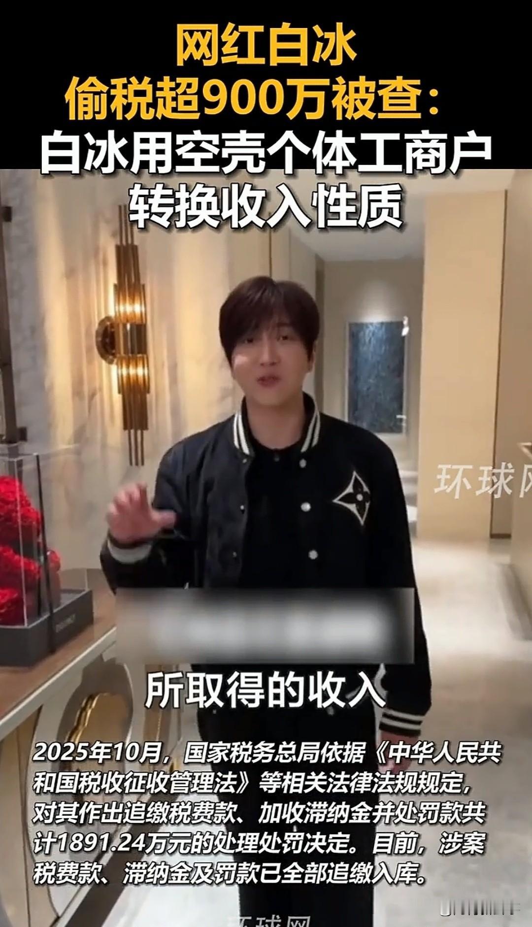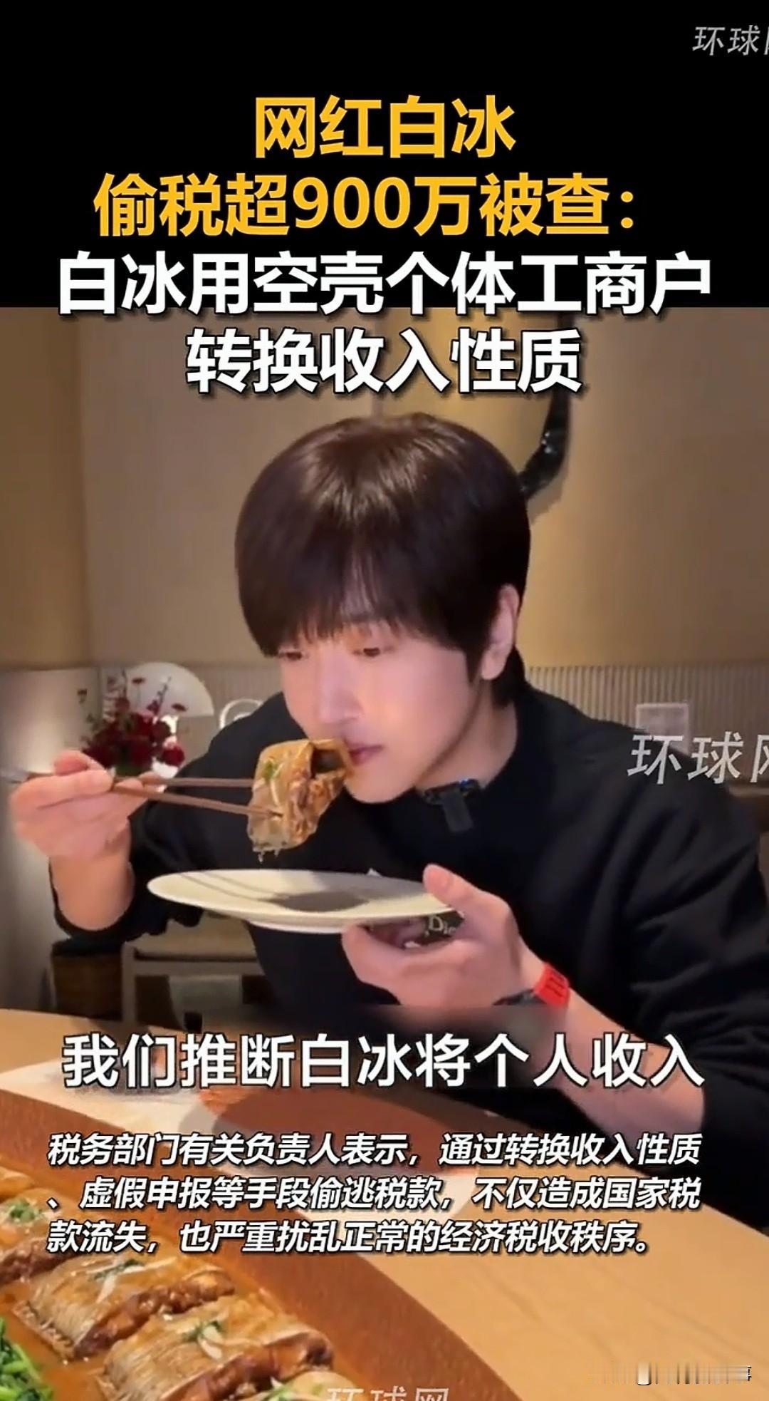 他的吸金能力,远超普通人的想象 4000万粉丝网红白冰,偷税被罚1891万 今天国家税务总局,刚发布了官方通报。 他是美食探店赛道的顶流博主。 靠着接地气的探店人设圈粉无数。 全网粉丝总量,突破了4000万大关。 2021年到2024年,他动了偷逃税的歪心思。 通过注册空壳个体户,转换收入性质虚假申报。 4年间累计少缴各类税费,高达911万余元。 他单条1分钟广告报价,就高达132万元。 目前涉案款项已全部追缴入库,分文不少。 他的多平台账号,已被全面禁言无法关注。 依法纳税是每个公民的法定义务。 流量从来不是违法的挡箭牌,公众人物更该守底线。 你觉得顶流网红偷税被禁言,是罪有应得吗?