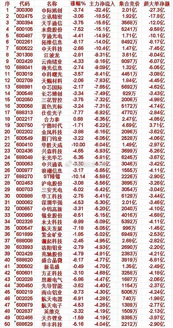 主力疯狂出逃!50只资金重灾区名单曝光市场降温信号已现!今日主力资金净流出前50股出炉,中际旭创、立讯精密、天孚通信等科技龙头遭大资金甩卖,最高净流出超32亿,宁德时代、中芯国际等权重股也被大额抛售,资金出逃潮来势汹汹!名单里多为前期热门赛道股,部分个股大跌超10%,资金出逃迹象明显。大资金的撤退方向就是市场风险预警,这些个股短期需高度警惕,别被深套!关注我,带你避开资金雷区,守住账户安全