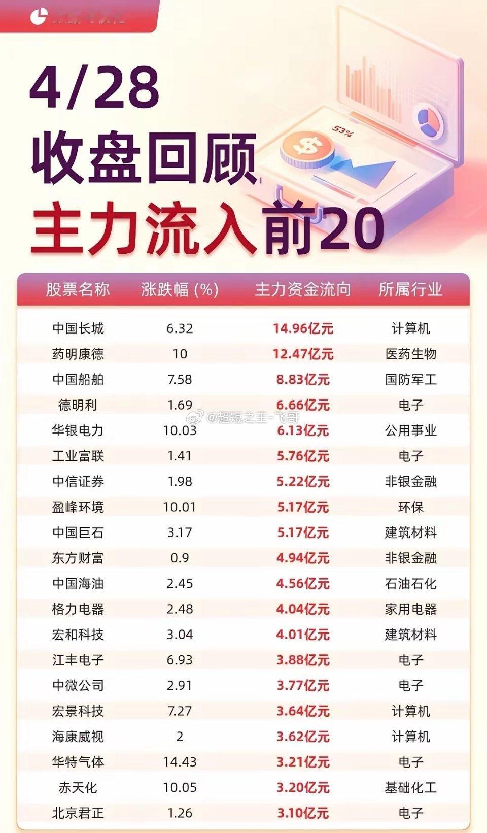 4月28号资金动向复盘:真的是跑的跑、抢的抢,两边画风完全不一样。光模块、通信这些前阵子的热门赛道,今天直接被主力砸懵了,中际旭创一家就跑了32亿多,天孚、永鼎这些也跟着被甩卖,看得出来资金是真的慌了,AI、算力相关的票基本都在遭重。反倒是医药、军工、公用事业这些偏防守的方向,成了资金的避风港。中国长城、药明康德、华银电力这些票被抢着买,不少直接拉了涨停,说明现在资金更愿意去低位、确定性高的地方抱团了。我感觉这就是典型的高低切换,赛道高位的资金在出逃,低位防御板块在接盘,短期市场的避险情绪已经起来了,高位的热门票还是得小心点。(以上仅为个人观点,不构成任何投资建议)