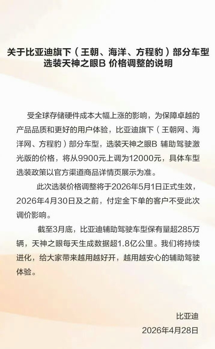 王朝网、海洋网、方程豹部分车型,选装天神之眼B 辅助驾驶激光版价格,将从9900元上调到12000元,5月1日之前生效….