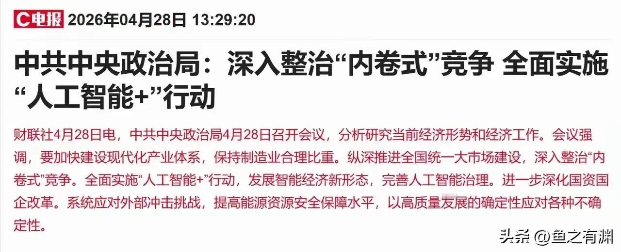 今天中央政治局开会,深入整治“内卷式”竞争,全面实施“人工智能+”行动!大快人心! “内卷”这个词,这几年特别流行,大家都感触很深,孩子上学是这样,工作是这样,企业竞争是这样,好像全社会都是处于高度竞争之中,但很多大家都知道是无效的。总有一股“只要卷不死,就往死里卷”的趋势,让人焦虑。 商业上打价格战,同类企业为了生存拼命压榨员工,“我不卷死你我就得死”的游戏里,所有人都知道没有赢家。再看看那些老板打着加班快乐,打着“996”的公司,哪个不是这样? 这个问题中央政治局专门解决,那些靠恶意竞争和压榨劳动力,以后是不可能的了!后续怎么办?需要有细化的实施方案,手术刀对搞996的寡头企业?低端制造业?还是那些榨取骑手的平台? 全面实施“人工智能+”行动,这是将来发展的大趋势,发展新质生产力,需要的是科技,需要的是人才!而不是那种低端产业和重复劳动能实现的。高质量发展是全社会的共同责任。