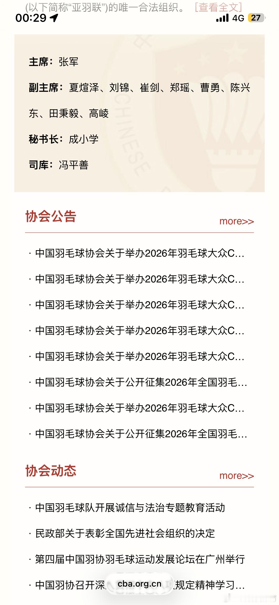 中国羽协领导名单调整 近日,中国羽毛球协会官网更新,领导名单出现变化。更新后的领导名单中不再有担任副主席的崔剑。此前据人力资源和社会保障部官网2月27日消息,任命崔剑为国家体育总局副局长。