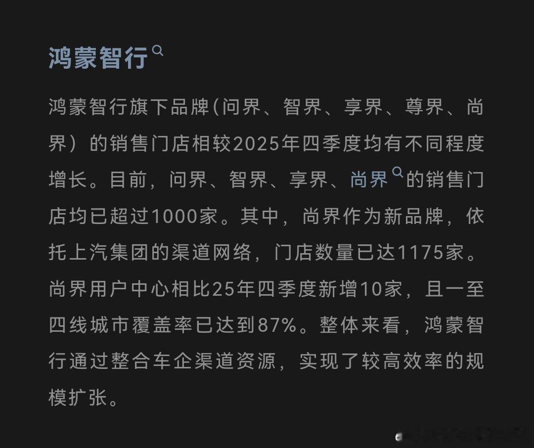 杰兰路一季度品牌渠道建设情况,尚界门店已经超过1175家,一到四线城市覆盖率超过87%,渠道确实很强鸿蒙智行