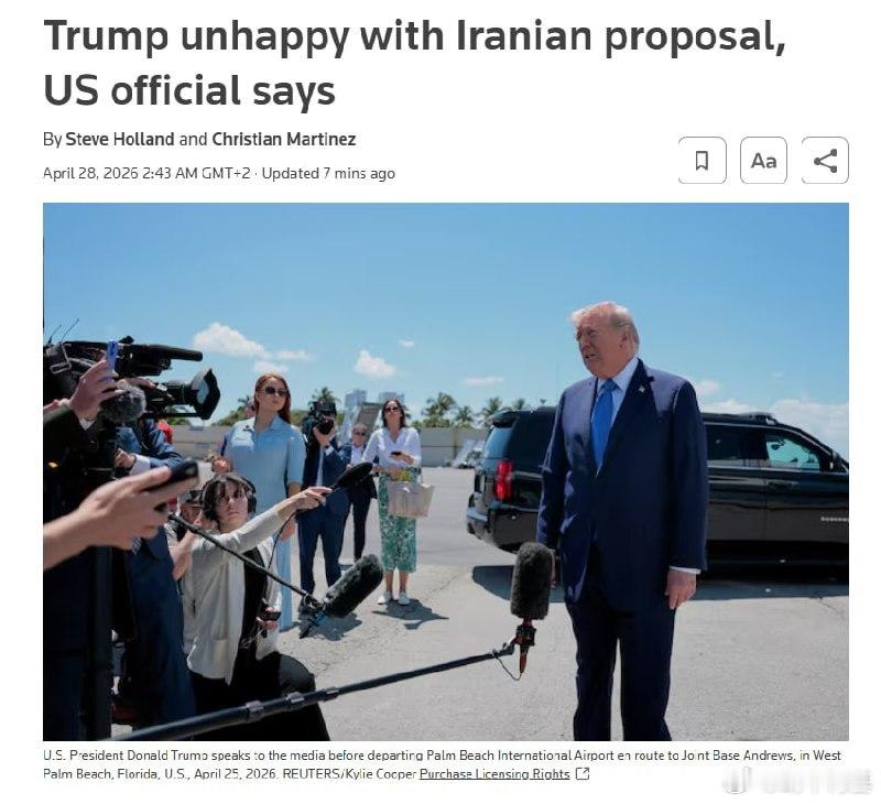 特朗普对伊朗最近提出的提议感到不满,不太可能接受伊朗的最新提议,因为该提议没有涉及伊朗的核计划,并要求解除美国的海上封锁。来源:CNN、WSJ、NYT哈梅内伊遇害以色列宣布袭击伊朗伊朗向美国提3个条件