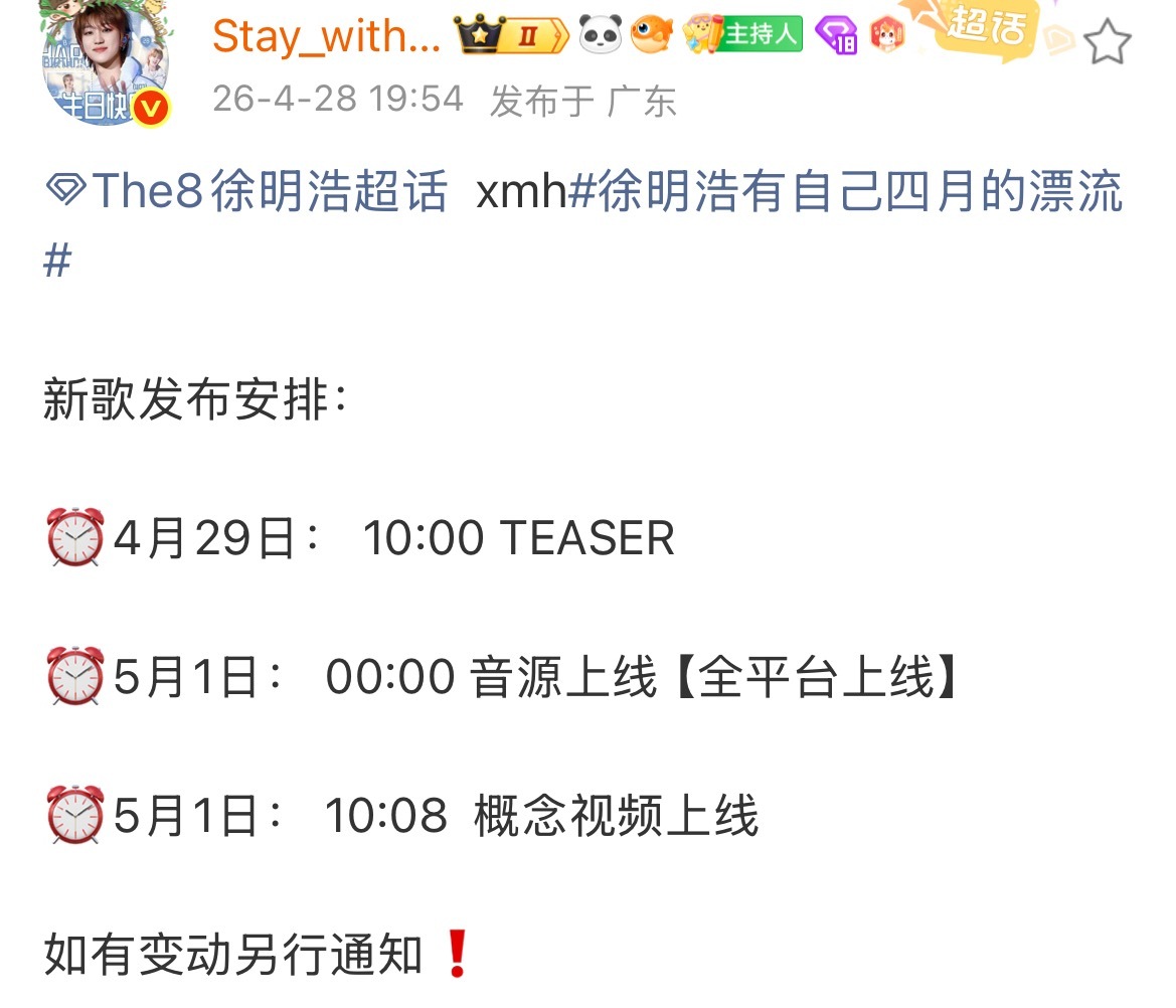 徐明浩新歌发布安排 徐明浩新歌要来了!很很期待住4月29日: 10:00 TEASER5月1日: 00:00 音源上线 【全平台上线】5月1日: 10:08 概念视频上线