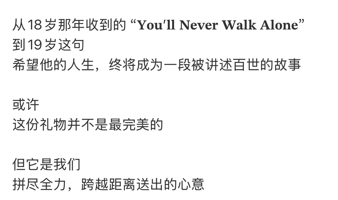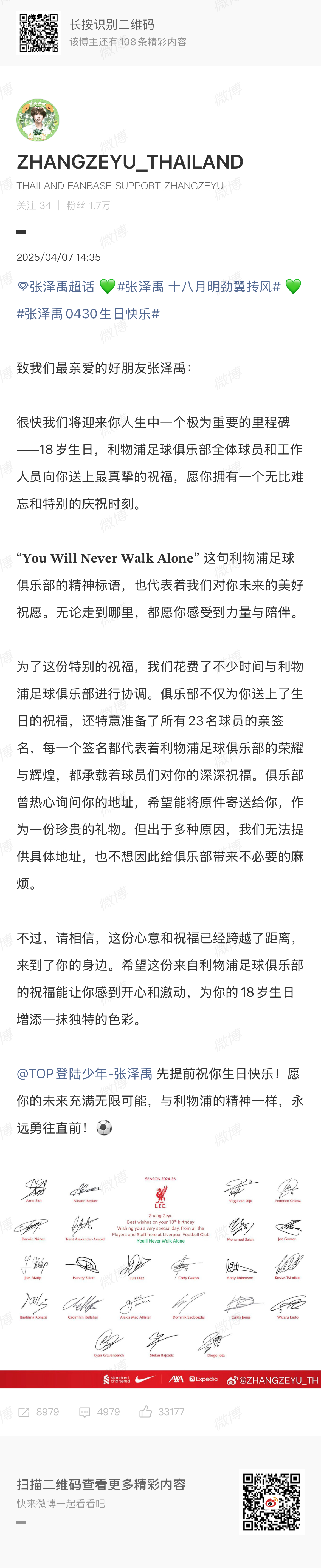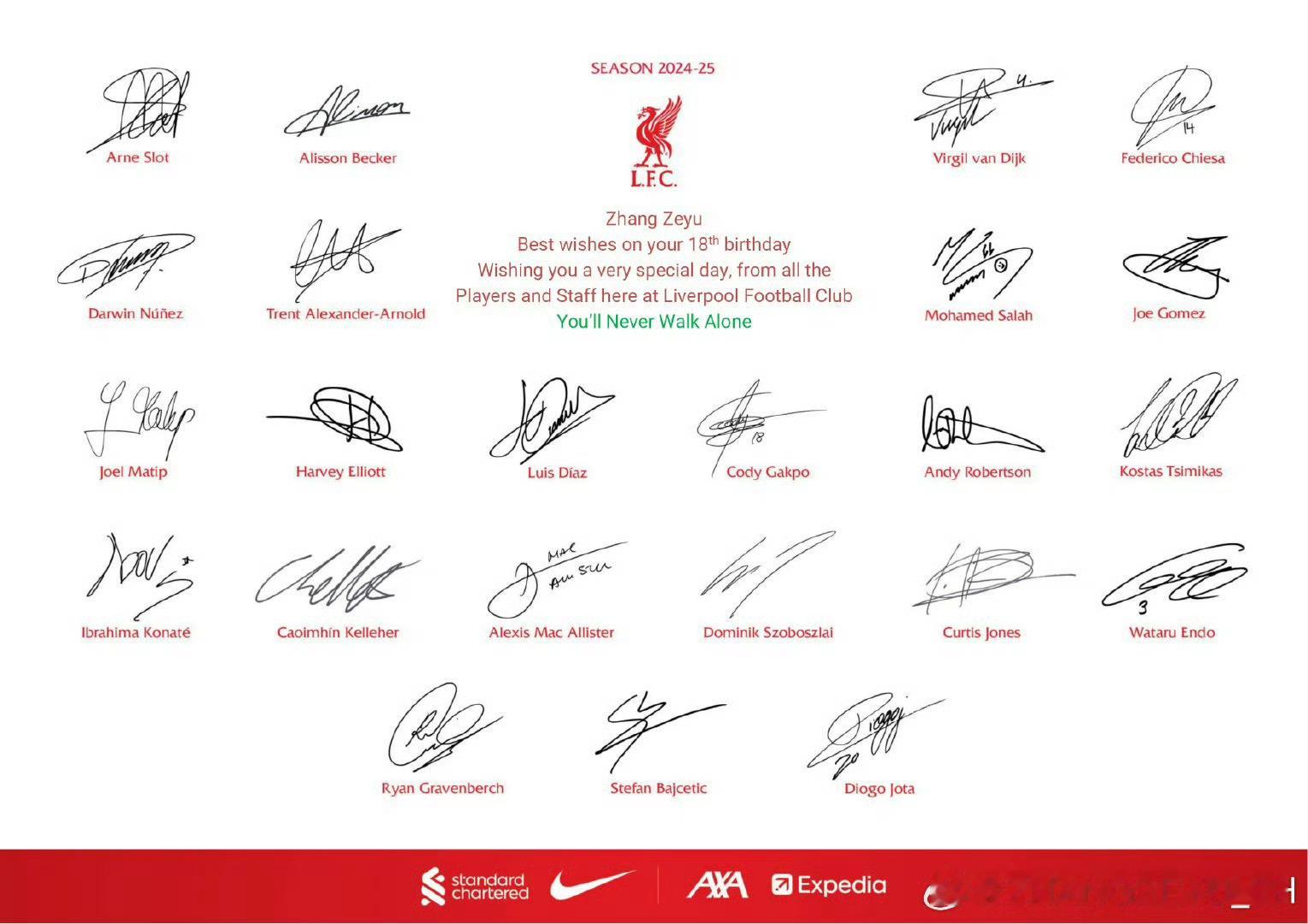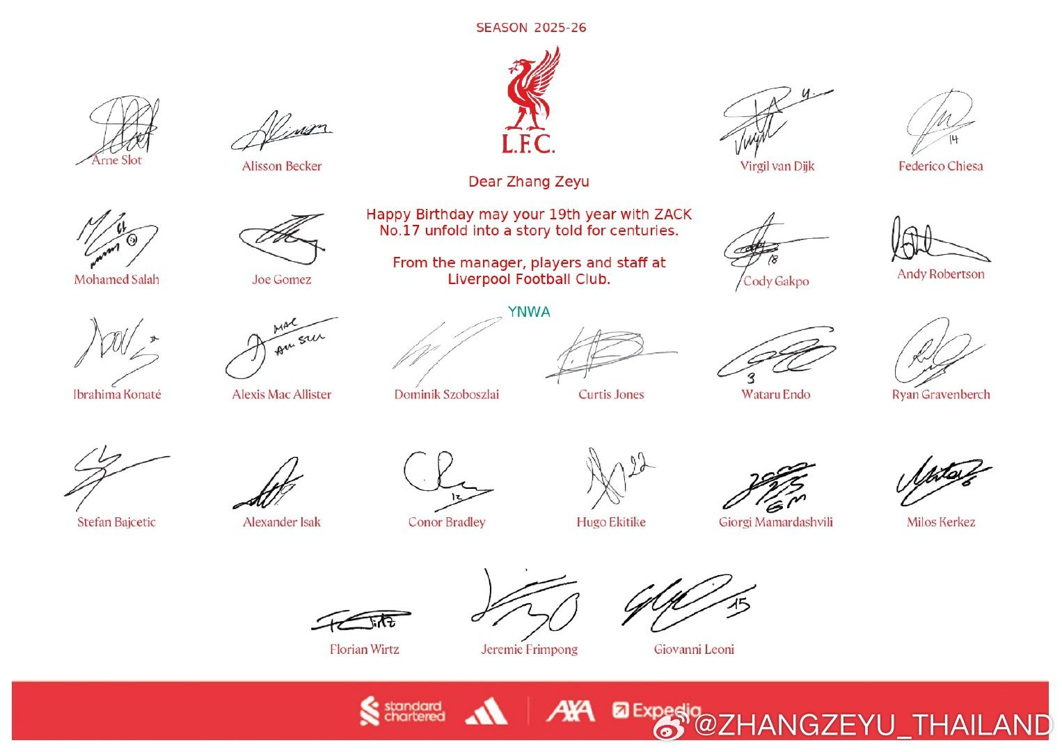 张泽禹连续两年收到利物浦的生日祝福张泽禹泰站跨越山海的应援好用心!连续两年的生日都努力为他换来利物浦的专属生日祝福💚 从18岁“ You'll Never Walk Alone”到19岁“希望他的人生,终将成为一段被讲述百世的故事”,全队签名贺卡独一份的浪漫。跨国礼物满满爱意