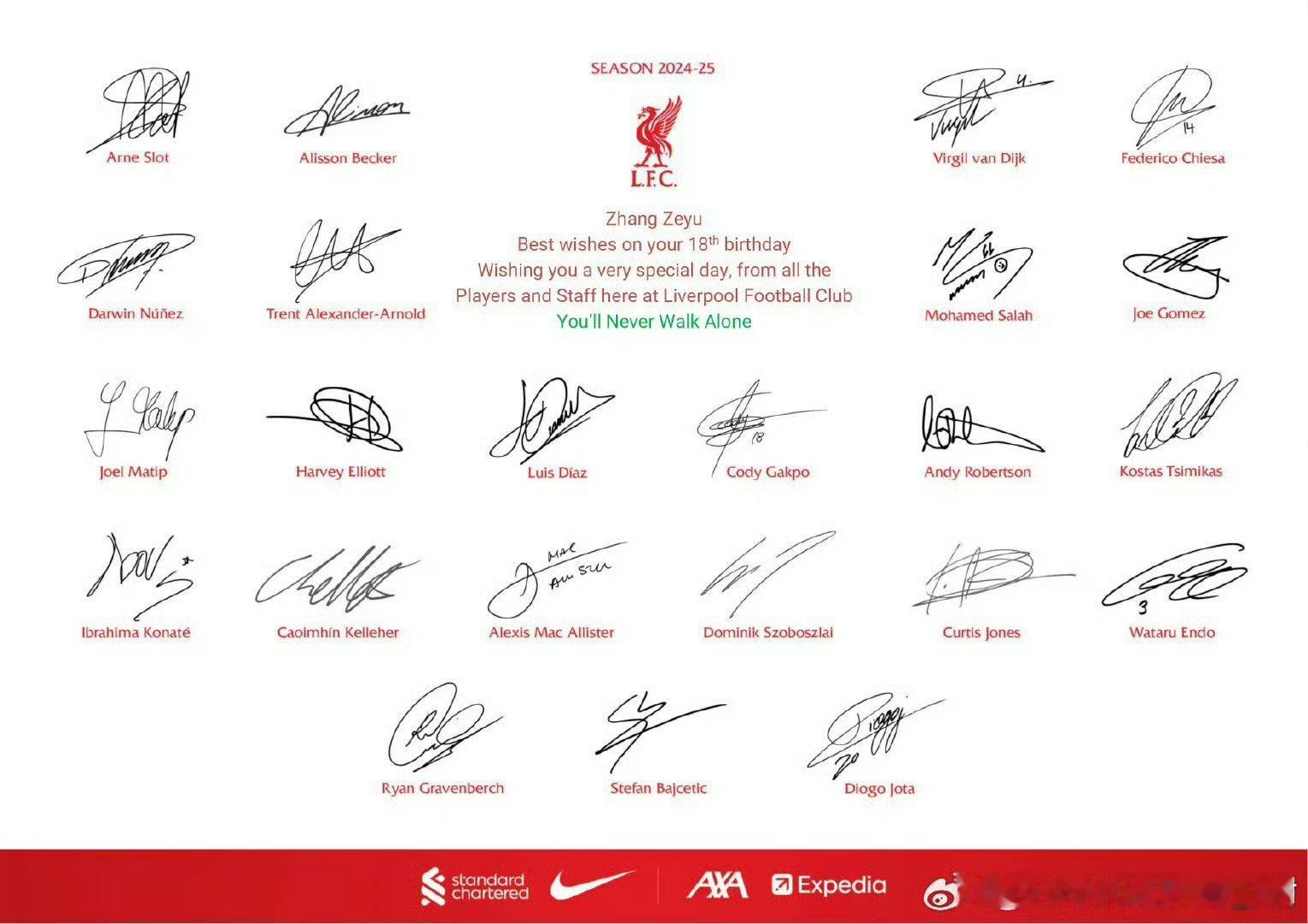 张泽禹连续两年收到利物浦的生日祝福 全队签名贺卡,每一笔都是祝福。连续两年定制文案,每一句都是用心。张泽禹泰站让我相信,追星从来不是单向的,爱真的可以跨越山海被送达💚