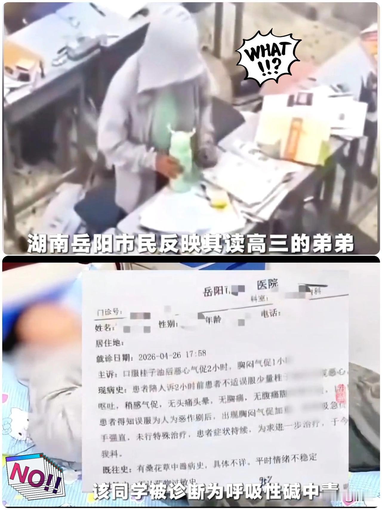 岳阳一高三男生恶作剧,往同学水杯里倒桂子油! 这让我想起了我家哥哥的水杯也被人放过东西,每天早上我都会给他倒掉水杯里前一天的水,有一次发现他的水杯里的水有一股药味,我就问他,你的水里怎么会有一股西药味,他说他不知道,我跟老师反应了,老师也是轻描淡写的就过去了,现在想想都后怕。 岳阳这事儿看得人后背发凉,这哪里是同学间的玩笑,分明是毫无底线的恶意伤害! 本该是并肩备战、一同冲刺高考的朝夕同桌, 对方却心思歹毒、居心叵测,在背地里偷偷把槟榔伴侣倒进受害者的饮水杯里! 无辜的受害者毫不知情喝下之后,当场身体失控抽搐不止,直接引发呼吸性碱中毒,险些酿成无法挽回的惨剧! 哪怕现在身体侥幸没有留下器质性伤病,可这场突如其来的恶意暗算、这场平白无故的无妄之灾,早已在心底刻下了挥之不去的心理阴影! 有人说,这不就是一个恶作剧吗,有必要上纲上线吗?我想问你,要是你的孩子被人这么恶作剧,你会怎么想? 教育局说了,将督促学校加强管理。是啊,老师不可能时刻盯着每个学生的保温杯啊,这种行为恶劣的很,家庭教育缺失的很,才会教育出这样不懂尊重,不懂珍惜,不懂生命的孩子来。