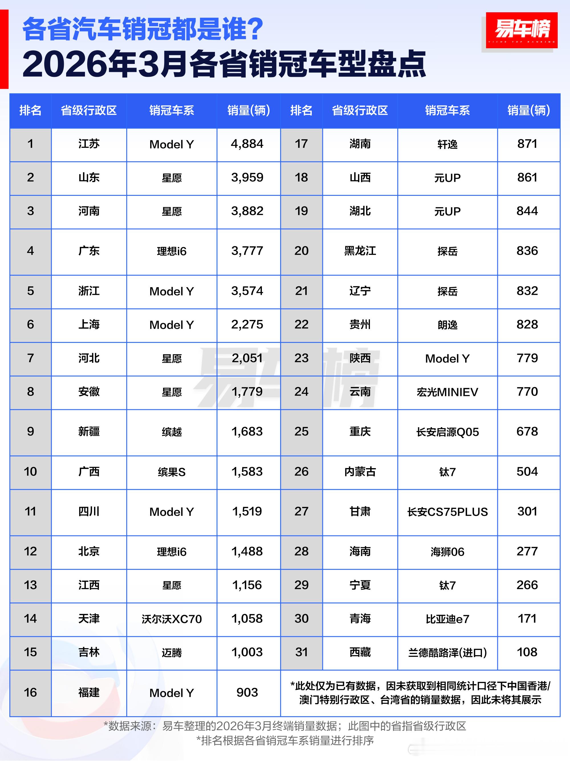 26年3月Model Y在江浙沪、福建、四川、陕西是销冠特斯拉在上海是销冠特斯拉
