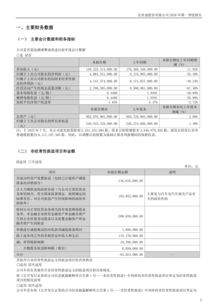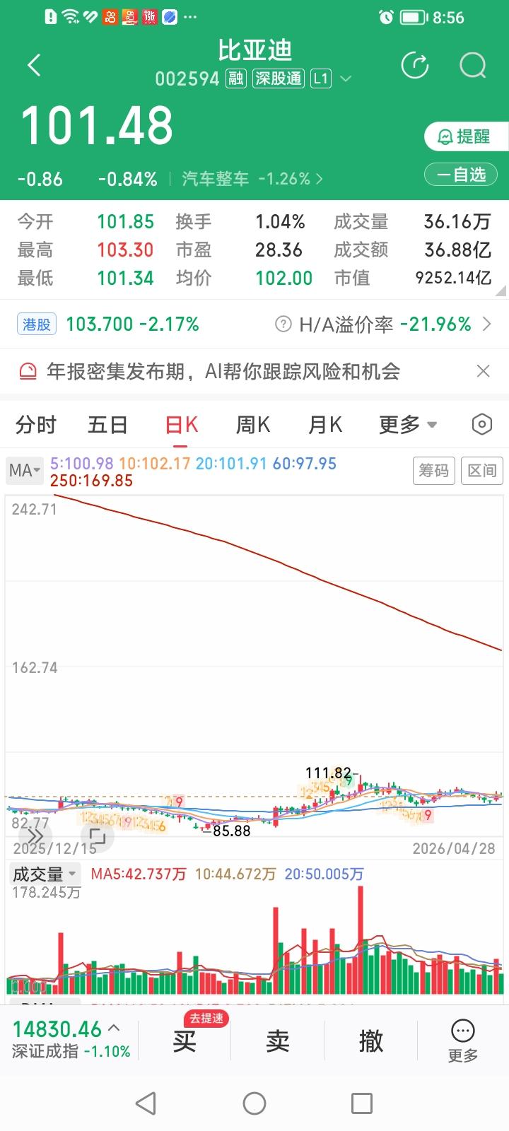比亚迪业绩谷底到了吗?比亚迪今晚披露的一季报业绩归母净利润同比下降55.38%,是不是有点难看? 尽管4月份新能源汽车的销量还没有公布,但4月份以来油价飙升应该对电动汽车的销量构成利好,而且从北京车展比亚迪的技术实力和市场表现看,比亚迪的高端化似乎已渐入佳境,不排除二季度比亚迪的销量和利润会有起色。 明天比亚迪在业绩下滑利空冲击下,会出现较好的买点吗?