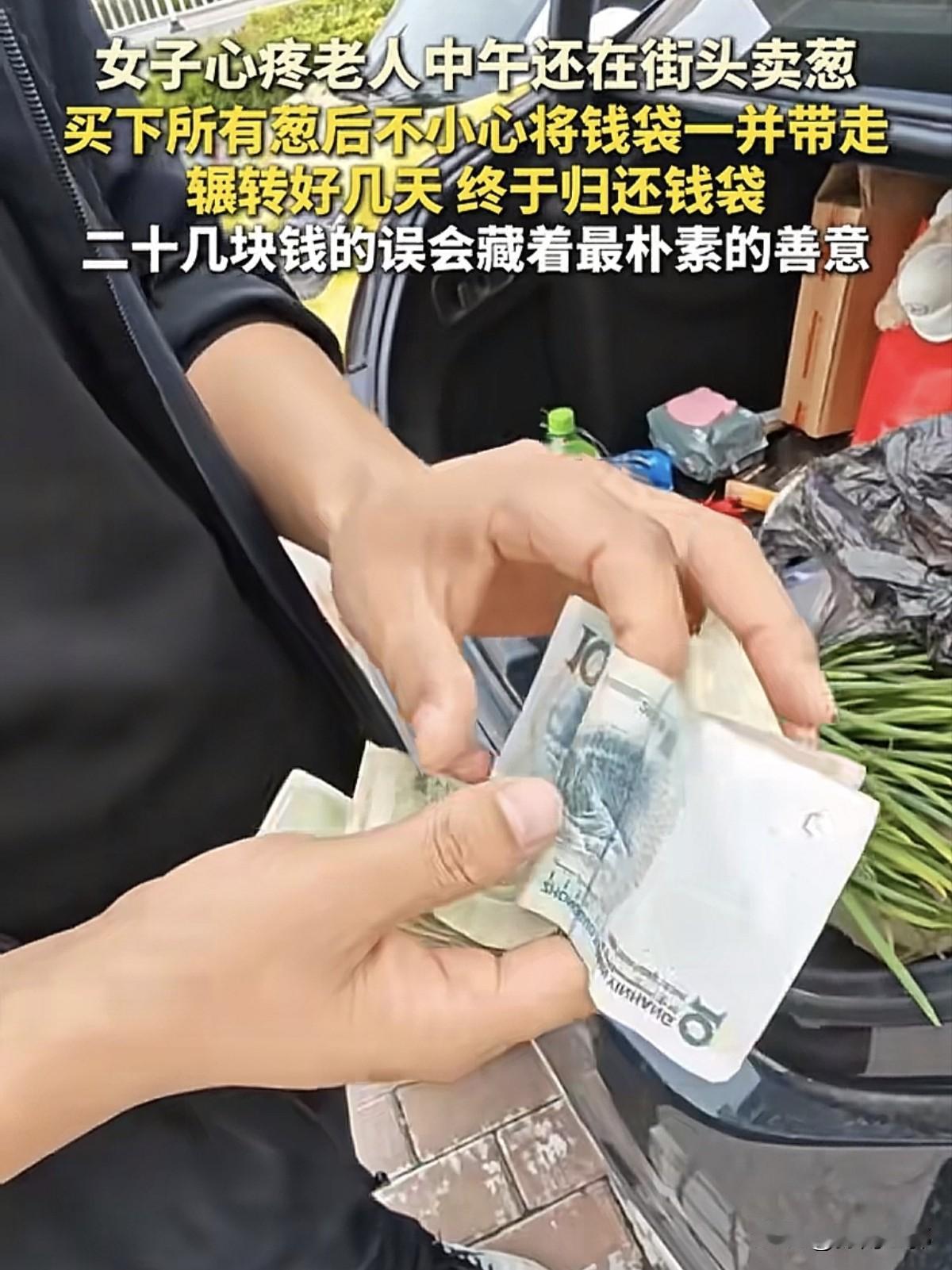 河南濮阳的赵女士与家人出去吃饭,停车的时候发现一位老人在路边摆摊卖葱。 看着已经到了中午了,老人家还在那里摆摊,赵女士出于好心为了让老人快点回家就上去把葱全给买下来了。 剩下的葱一共才花了6块钱,装了一大袋子然后就放在了车里了,回到家里的时候,发现装葱的袋子里边还有一个黑色塑料袋,打开一看是22块钱,这是那位老人家卖葱的钱。 不知道怎么着,那位老人把自己的钱忘到了袋子里边。 赵女士发现钱后连忙回去找,没有找到老人,老人已经回去了。 这是老人家摆地摊卖自己种的菜,卖了一上午挣到的钱,丢了,老人家肯定也挺着急的,22块钱对很多人来说可能就是一包烟的事情,但对老人来说那是自己的辛苦钱。 女士怕老人着急,第二天又到现场去寻找,还是没有找到,到了第三天才终于找到那位老人家。 赵女士上前问老人,你知道你的钱丢了吗? 老人回答道:知道!知道!那天中午知道钱丢了之后,他和老伴儿中午饭都没有吃。 看到赵女士把钱递了过来,老人家脸上也终于露出了笑容,失而复得的22块钱,对老人来说,就是个大事情。 高兴的把老伴叫到现场,说钱已经找回来了,然后张女士又给老人买了一些礼物,送给了老人。 22块钱的误会,藏着最善良朴素的心,老人没有想到钱又找回来了,也就是22块钱,自己也记不清当时是丢到哪里了。 河南濮阳赵女士的大爱并且心善想帮这位老人,没有想到把这位老人的22块钱给带走了。 发现后连着两天回头去找这位老人,钱虽不多,也只有22块钱。赵女士知道,对于一个农民来说,22块钱是他们辛苦劳动的成果。 丢了22块钱,老人家肯定会着急的,第一天没有找到他,就接着第二天继续找,问了很多人才,终于找到了。 赵女士这种大爱的精神值得我们去赞扬,值得我们去宣扬。 我有时候写文章,可能有些人又在评论区啊,还在下面留言说我编的编故事。 我在这里声明保证一下,我每写一篇文章,都是来自官方媒体的报道去写的,事件大家可以去搜的! 今年的大葱也比较便宜,在农村便宜的时候甚至是几毛钱1斤,虽然几毛钱1斤,从种植到收获需要长达几个月的时间。 老人家在一点一点的从地里把它刨出来,拉到集市上去卖,卖了一上午,好不容易来个人花了6块钱,把剩下的一堆葱买走了。 回去的路上还挺高兴的,结果到了家里发现钱没有了,其实这不是一个上午的劳动成果没了,这是几个月以来的希望没了。 也就是22块钱,老两口心疼的连午饭都不吃了,对很多人来说,可能不理解,但对于生活在农村里的小编来说,农村人挣个钱真的不容易。 农村的老人不像城市里边,到了60岁退休了,拿着退休金可以到处玩啊,到处转,不用去工作了。 但是河南农村的老人到了70多岁了,还在种地,有的80多岁了,还在种地! 他们种的地不多,可能就几亩地,一年的收入,除了买化肥呀什么的,买农药啊,可能也就纯收入个几百或者几千块钱。 有些老人没有办法的情况下,种一些蔬菜拿到街上去卖,来补贴家用了! 因为他们没有生活的保障,靠那100多块钱的养老金也过不上无忧的生活。