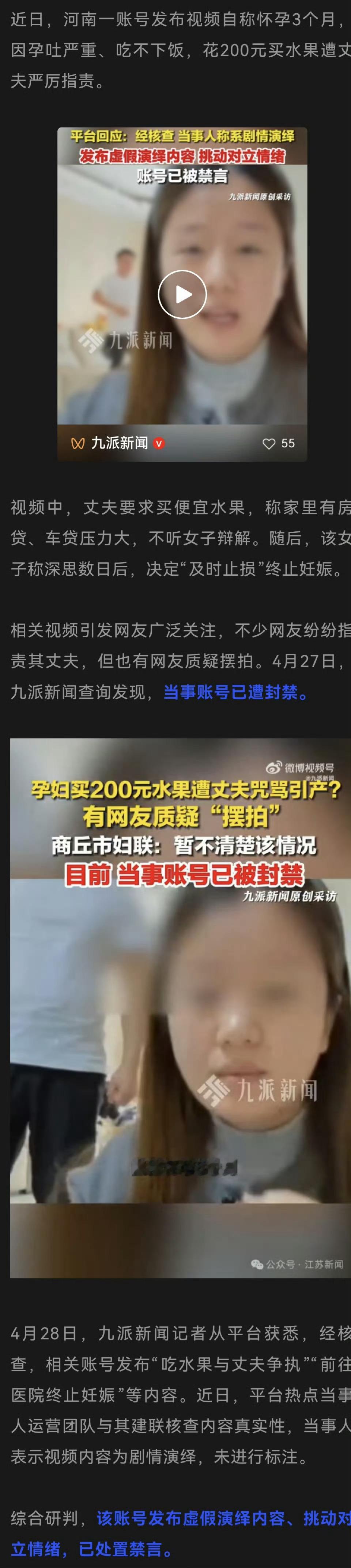 “孕妇200元买水果遭丈夫咒骂后引产”为虚假演绎内容、挑动对立情绪,账号已禁言 !热点观点