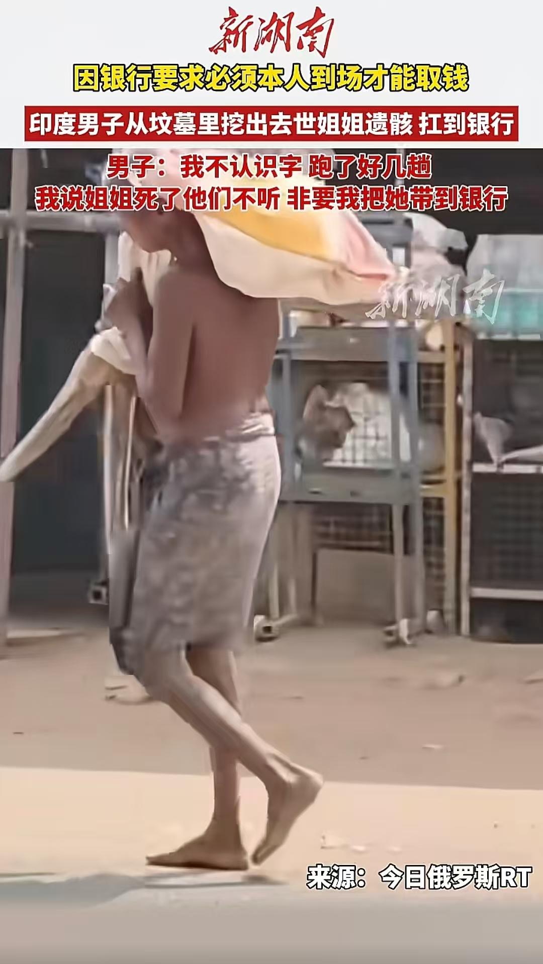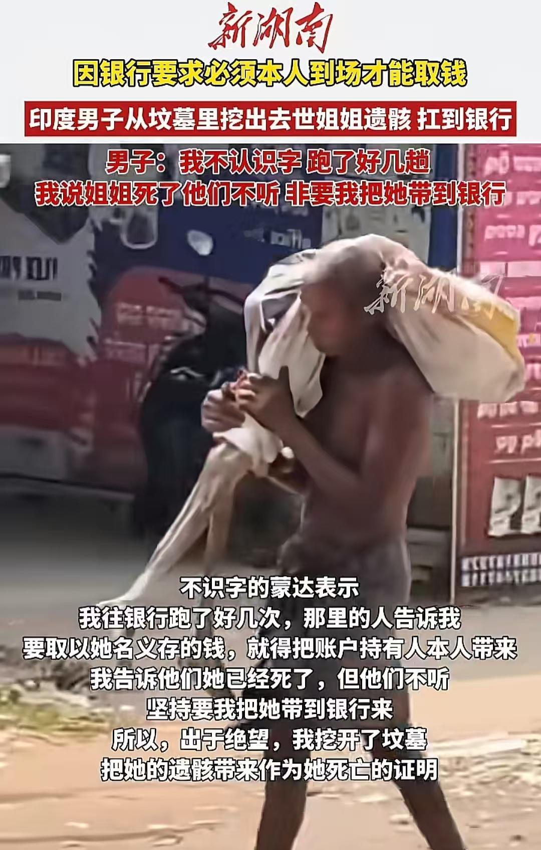 印度男子为了取出已故姐姐账户里的那点钱,硬是被逼得挖开亲姐姐的坟,把尸骨扛在肩上,走了整整3公里去银行,只为“证明死亡”。 吉图·蒙达,50岁,部落居民,大字不识一个。他姐姐卡尔拉今年1月去世,账户里剩2万卢比,折合人民币大概1700块。这是他姐姐卖牛攒下的全部积蓄。 更要命的是,姐姐账户里登记的指定继承人,是她的丈夫和儿子。可这两个人,也已经死了。这样银行就更不敢把钱给男子了。 多次碰壁之后,吉图做了一个谁听了都得愣三秒的决定。扛起锄头,走到埋姐姐的地方,挖开了。把骸骨用布裹好,扛上肩膀走了3公里,放到了银行门口。 最后警察介入,吉图最后拿到了那笔钱,姐姐的遗骸也重新安葬了。但你我都清楚,在世界上还有无数个吉图,工作人员态度冷漠、“踢皮球”现象普遍,普通人办事成本极高。对许多偏远农村的文盲或半文盲来说,这些程序几乎是“天书”。 当生者的证词不被采信时,他只能让死者亲自到场。这不是他选择了野蛮,而是所谓的现代文明,在他面前关上了所有那扇叫作“变通”的门,只留给他一条最古老的活路。
