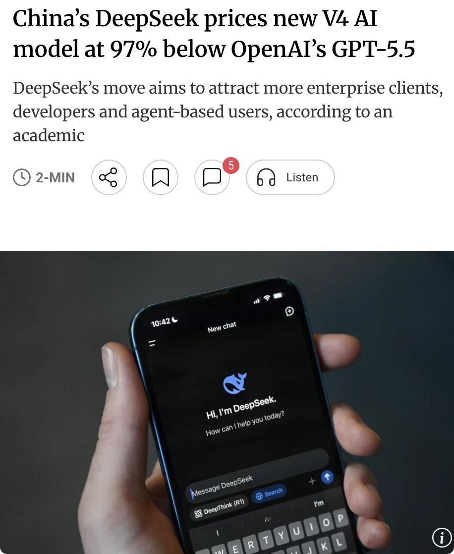 外媒:DeepSeek新模型V4定价较OpenAI GPT-5.5低97% DeepSeek大幅下调旗下AI模型价格,最新旗舰产品V4系列的API"输入缓存命中"费用降至原价十分之一,最低输入成本约为每百万token 0.14美元,且永久有效。 为推广近日发布的V4-Pro,公司在5月5日前额外提供75折优惠,使其价格低至每百万输入token仅0.0036美元。相比之下,OpenAI的GPT-5.5缓存输入定价为每百万token 0.5美元。由于对话中输入通常是输出的三倍,综合计算,GPT-5.5每次对话成本是DeepSeek V4的32倍,即DeepSeek比OpenAI便宜约97%。 此番激进定价策略与近期Kimi K2.6、智谱GLM-5.1等国内大模型涨价形成鲜明对比,DeepSeek逆势降价,被外界认为可能在中国基础模型市场引发新一轮价格战,吸引更多企业客户、开发者及AI智能体用户。