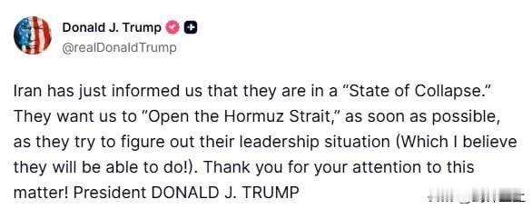 懂王在经历了白宫晚宴枪击事件后,更疯了! 懂王刚刚发布动态说:伊朗人通知他,伊朗正在崩溃,希望美国尽快开放霍尔木兹海峡…… 看得出来,懂王是真的很想打开霍尔木兹海峡,可是真的又无可奈何