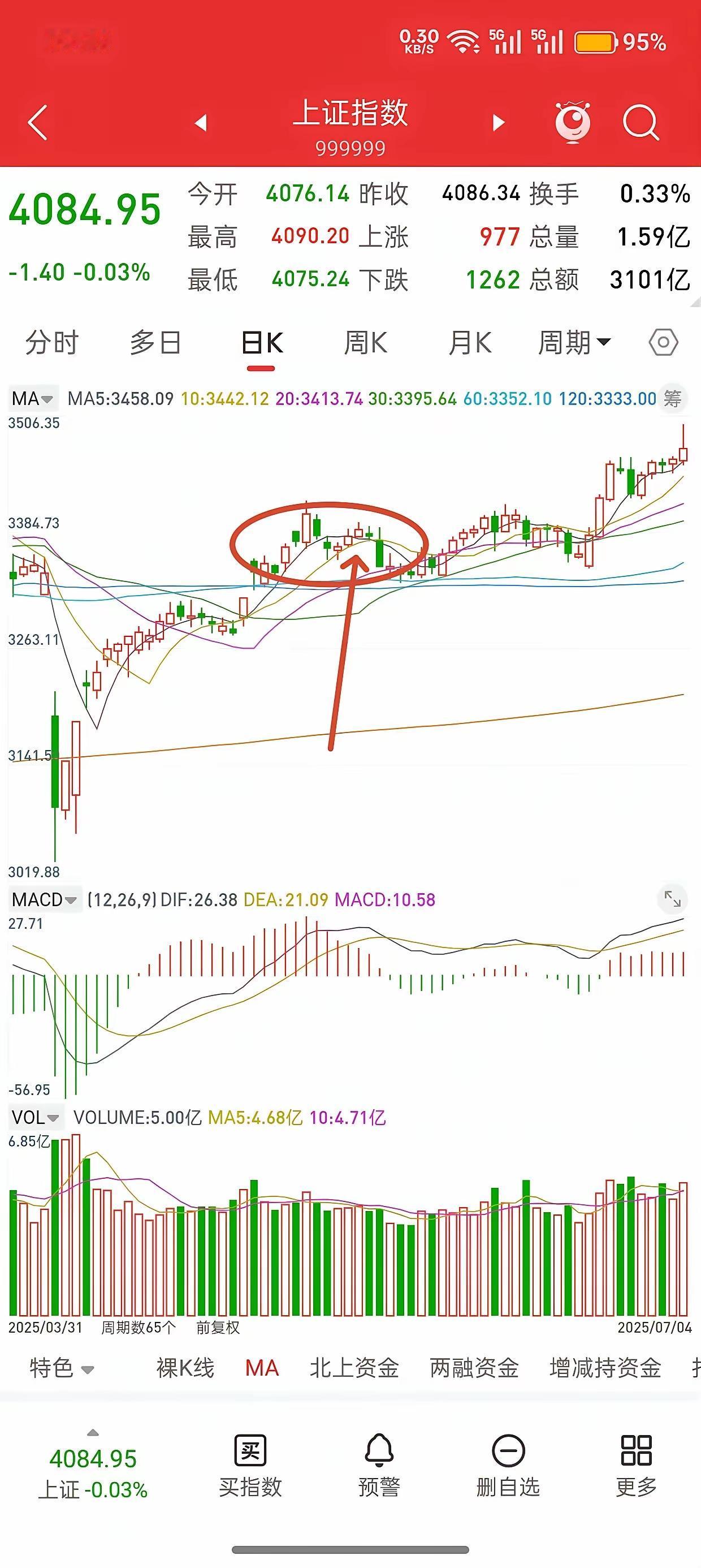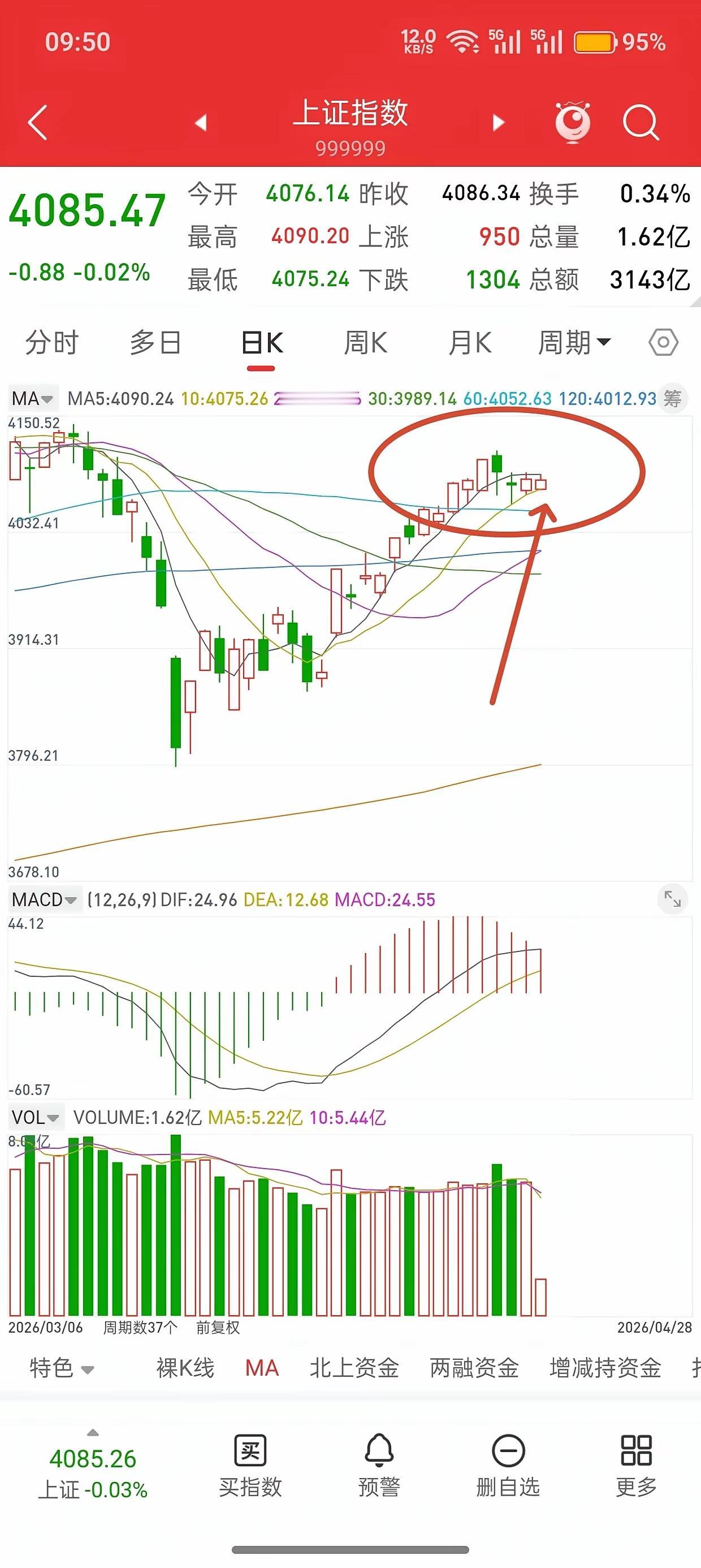 A股这波反弹,别上头!接下来的动作,老股民都懂 今天打开盘口,不少人又在喊“牛回!速归”,但我得泼盆冷水——这波从3794爬上来的反弹,差不多要停了。不是吓唬人,看看筹码分布图就明白,4100点附近堆着多少套牢盘?去年3月追高的、今年年初站岗的,密密麻麻全是等着解套的筹码,主力会这么好心帮人抬轿子? 想起2025年5月那波行情没?4月7号大跌砸出黄金坑,后面一路涨到套牢盘密集区,看着要突破了,结果一根中阴线砸下来,洗盘洗得那叫一个狠,多少人割在地板上?现在这走势,简直是复刻版。 3月23号那波大跌,不就是今年的“黄金坑”?从3794弹到4114,刚好摸到3月份套牢盘的边,这时候谁还敢追?主力比谁都清楚,不把这堆浮筹洗出去,拉得越高,后面砸得越惨。 有人说“现在量能还在放大,怕啥”,但你看看细节——最近三天,上涨家数越来越少,涨停板数量从40多家降到20多家,资金都在偷偷跑。尤其是那些前期炒得猛的AI、算力股,今天下午好多都在“钓鱼线”出货,看着往上冲,其实是主力在悄悄减仓。 再看均线,20日均线现在在3980点附近,这位置太关键了。2025年那波洗盘,就是跌破20日线后才企稳,这次大概率也躲不过。别觉得跌破就是坏事,真到了那位置,反而能看清谁在裸泳——优质股会抗跌,垃圾股直接原形毕露。 给普通散户提个醒:手里仓位重的,趁现在还有反弹,赶紧把那些涨得离谱、没业绩支撑的题材股清一清。尤其是那种连板上去的,主力一跑,接盘的就是你。想加仓的,别急着动手,等那根中阴线砸下来,20日线附近再看机会,不差这几天。 有人说“万一踏空了怎么办”,踏空不可怕,套牢才要命。A股从来不缺机会,缺的是耐心。2025年5月洗盘后,优质股后来涨得比谁都猛,现在也一样——把风险过滤掉,剩下的才是肉。 盯着两个信号:一是成交量,啥时候缩到万亿以下,差不多就洗到位了;二是看北向资金,这几天它们净流出快50亿了,等它们回头加仓,再动手也不迟。 别被盘面的“假热闹”骗了,主力的套路就这么多,看懂了就能少吃亏。这波调整下来,真正的机会才会浮出水面,现在最重要的不是赚多少,是保住本金,等下一波行情启动时,你还有子弹。 不信?走着瞧,最多5个交易日,那根中阴线就会来。到时候再回头看,今天追高的,又是一阵悔。
