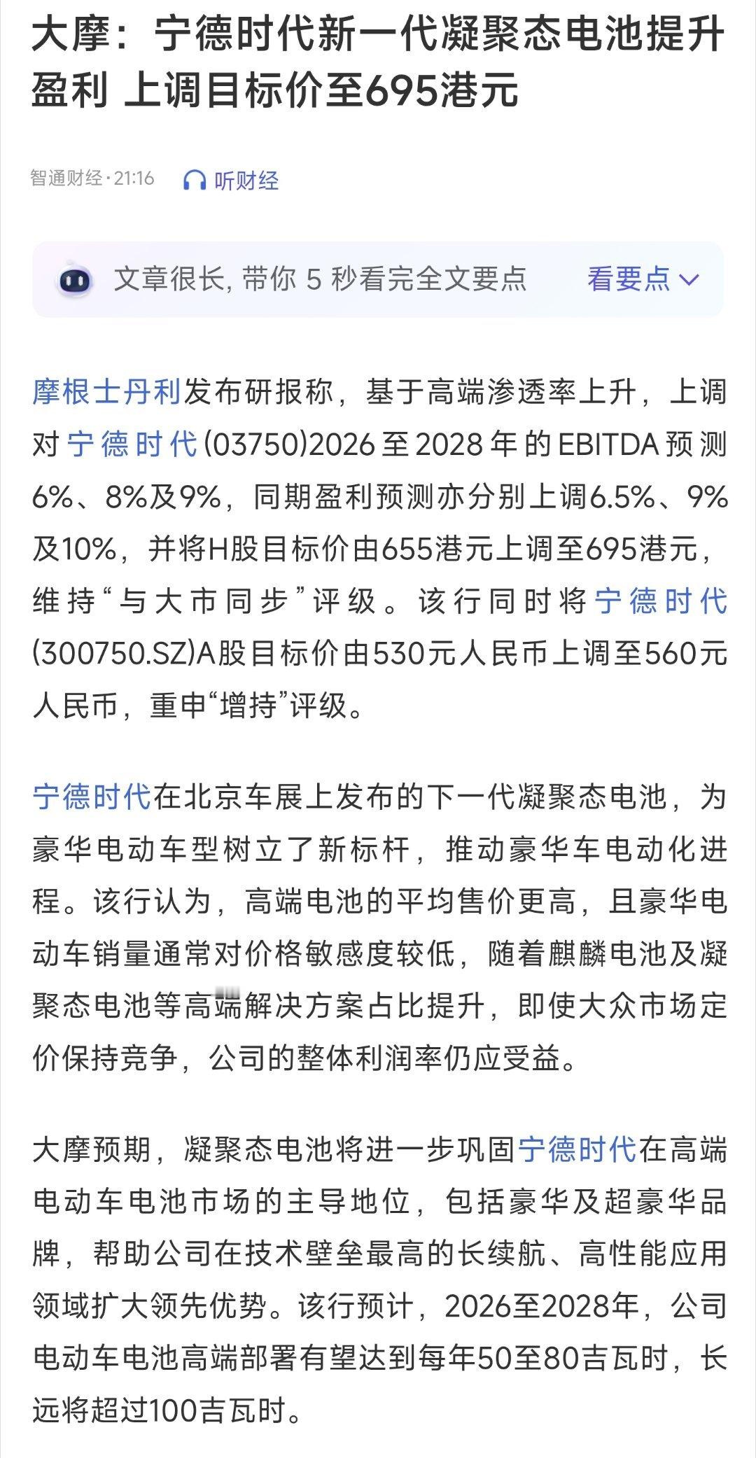 大摩:宁德时代新一代凝聚态电池提升盈利上调目标价至695港元