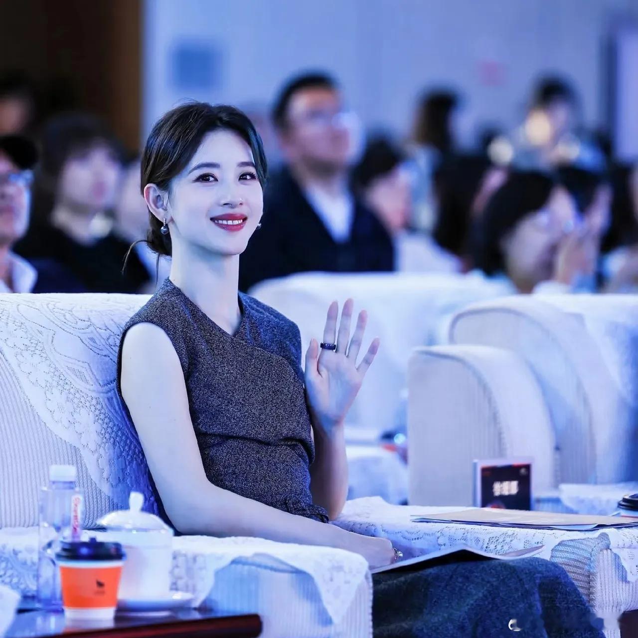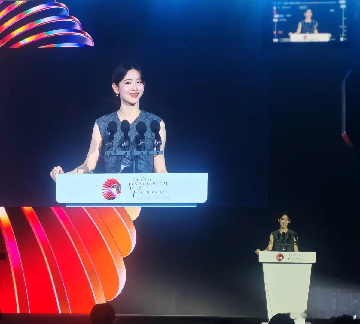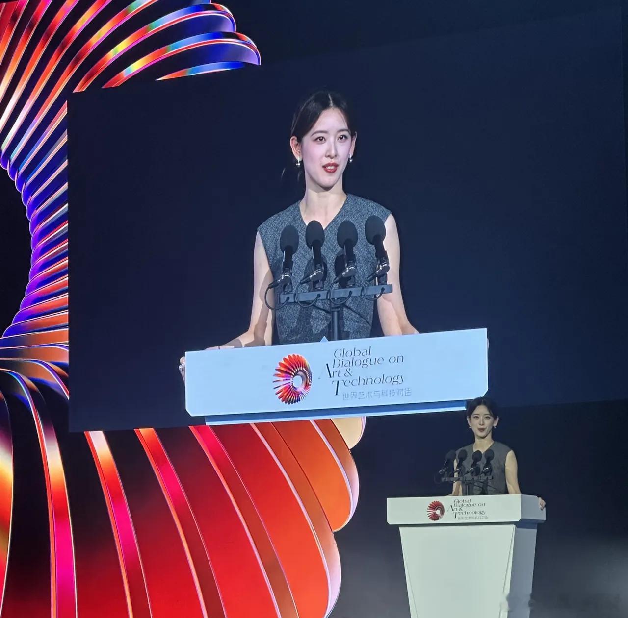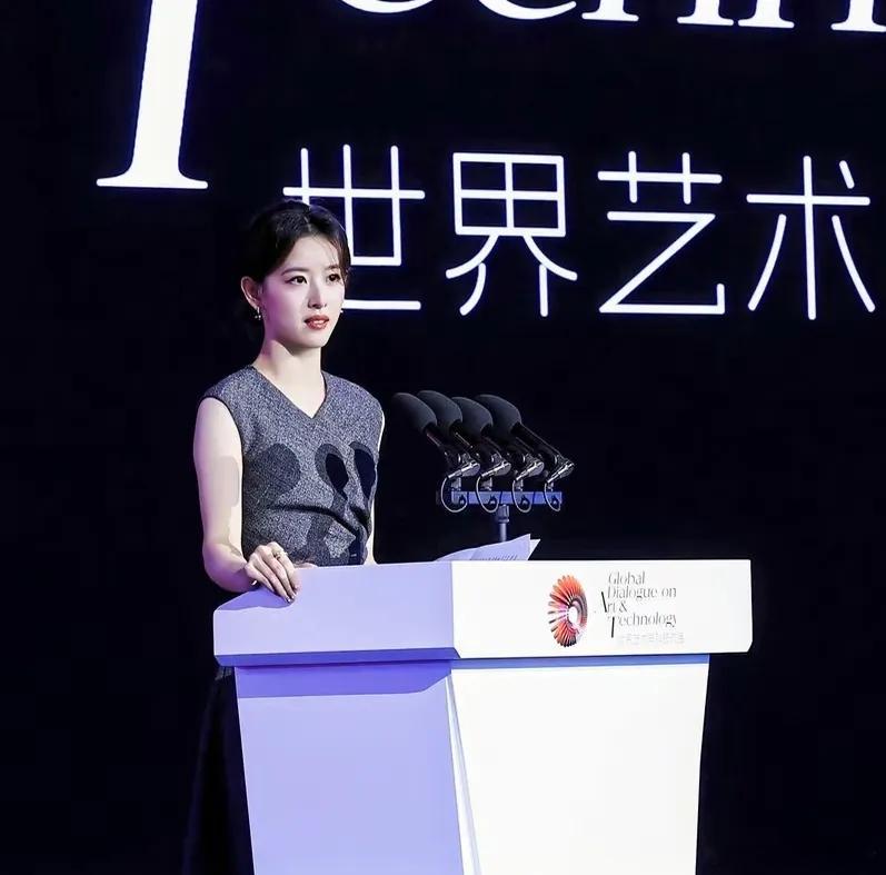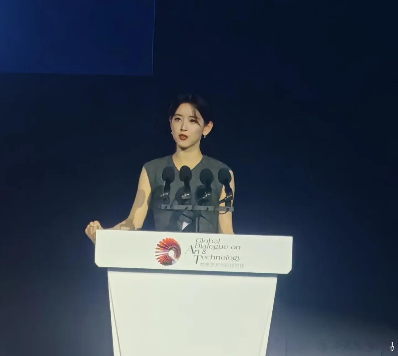 章泽天现身线下活动并登台发言,整个人气场十足。