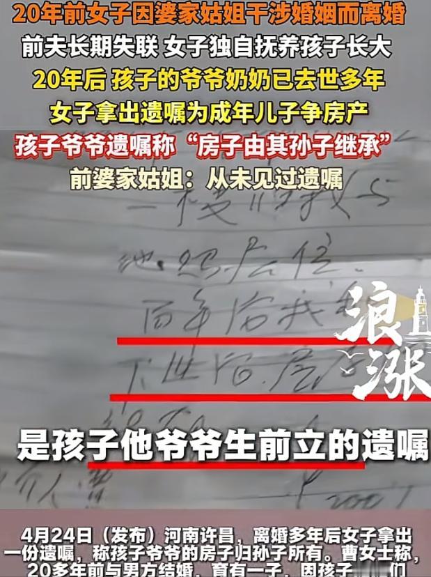 4月24日报道,河南许昌,曹女士是一名独自打拼多年的单亲妈妈,数十年独自将儿子抚养长大,如今孩子已经21岁,到了谈婚论嫁的年纪。因没有多余的存款为儿子购买新房,万般无奈之下,她想起已故公公生前立下的书面遗嘱,明确名下房产日后由孙子继承。名下房产日后直接留给孙子,可面对这份老旧遗嘱,大姑口头表示愿意让侄子回来居住,但在房屋产权归属这件事上,始终不肯松口。 最近在河南许昌,一桩因为分房子引发的家务事成了大家议论的热点,这事的主角是位单亲妈妈曹女士,她为了给到了结婚年龄的儿子弄套婚房,正跟家里的大姑姐闹得不可开交。 说起曹女士,这二十多年过得确实不容易,当年她结婚没多久,因为跟家里闹矛盾,在儿子才1岁大的时候就离了婚。 打那以后,她就一个人带着孩子过日子,这二十多年里,她既当妈又当爹,没白没黑地干活,省吃俭用供孩子上学读书。 而孩子的亲生父亲,离了婚就跑得没影了,别说给抚养费了,连面都没露过,就像人间蒸发了一样,曹女士一个弱女子,硬是靠着那股韧劲,把儿子拉扯到了21岁。 现在孩子大了,眼看就要踏入社会,谈婚论嫁的事也摆在了眼前,在当地,男孩子结婚没套新房是真的难。 可曹女士这些年的积蓄光是养活孩子、供他上学就花得差不多了,现在的房价又高得离谱,她哪拿得出几十万甚至上百万去买房啊?眼看着儿子因为房子的事可能连媳妇都娶不上,曹女士急得成宿成宿睡不着觉。 就在这走投无路的时候,她想起了一件压箱底的宝贝,那是孩子爷爷临终前写下的一份遗嘱。 当年爷爷还在世的时候,特别心疼这个小孙子,觉得孩子从小没了爹照顾太可怜,也觉得曹女士这个前儿媳妇自强自立、带大孩子太不容易。 老人家怕自己走后孙子没个遮风挡雨的地方,就亲笔写了份材料,明明白白地说自己名下的那套房产,以后直接留给孙子。上面有老人的签名和日期,这么多年曹女士一直小心翼翼地收着。 现在到了必须要房的时候,曹女士就把这份遗嘱拿出来,找到了孩子的几个姑姑,想着大家都是亲戚,希望能按老人的遗愿把房产过户给儿子。 孩子爷爷奶奶一共生了7个孩子,现在出头露面说话的是家里的大姑。 大姑的态度挺微妙,她嘴上倒是承认老爷子活着的时候确实说过要把房子给侄子,也说可以让侄子回老房子住,但一提到要把房产证的名字改成侄子的,她就怎么也不松口了。 大姑找了一堆理由,说这份遗嘱她们兄弟姐妹几个从来没见过原件,谁知道是真的还是假的?还说这房子既然是老辈留下的,那就是老曹家的共同财产,不能凭这一张纸就给了一个人,得等老老少少七个兄弟姐妹都聚齐了,大家坐在一块商量好了才行。 曹女士这边可等不起,她觉得白纸黑字写得清清楚楚,这就是老人的最后心愿,当儿女的理应尊重,而不是在这儿找借口阻拦,双方这么一僵持,亲情也淡了,火药味也重了。 这事传开后,很多邻里街坊都觉得曹女士太委屈了,一个女人孤身一人养大孩子,现在为了孩子的前途去争这份本该属于孩子的财产,合情合理。 大家觉得,爷爷当初立遗嘱就是为了弥补孩子缺失的父爱,姑姑们要是真为了孩子好,就该成全老人的心愿。 到目前为止,这房子到底能不能过户还是个未知数,曹女士说她会为了儿子硬拼到底,该走法律程序就走法律程序。 而大姑那边还是那句话,得商量着办,这起纠纷虽然是一套房子的事,但背后折射出的却是复杂的家庭矛盾和亲情考验,到底最后结果如何,大家都在等着看。 对此你怎么看? 信源:浪涨新闻