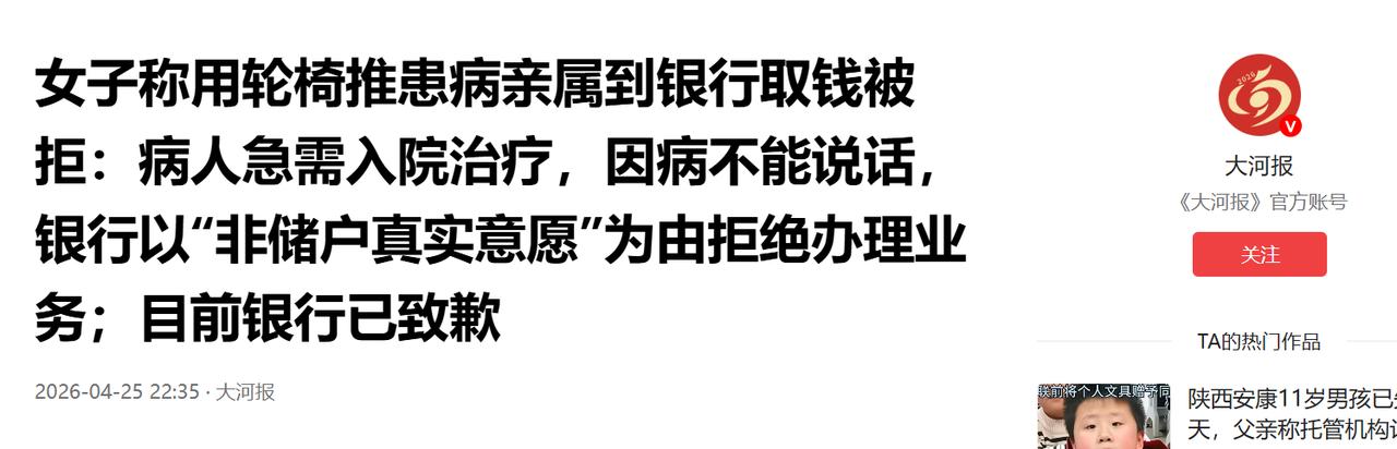 “救命钱取不出来?”4月24日,河北邢台,一男子患肝硬化,病情突然加剧,无法说话行动,急需入院治疗。可亲属去银行取钱时,因不是直系亲属被拒,无奈之下,亲属用轮椅把男子抬到了银行,可还是没能取出来!网友:存钱容易取钱难! 事情的主人公是河北邢台的石先生,他患上了肝硬化,原本就一直在治疗,可4月24号那天,他的病情突然加剧,整个人变得十分虚弱,嘴角还挂着血瘫在轮椅上,连话都说不出来,连基本的行动都做不到,急需一笔钱入院急救,每一分每一秒都耽误不起。 看着石先生奄奄一息的样子,他的嫂子王女士急得团团转,恨不得立刻就能取到钱,送他去医院。她赶紧翻出家里所有的相关材料,带齐了石先生的病历、身份证,还有各种能证明身份和关系的材料,急匆匆地赶到了邢台银行汇通支行,想着能尽快取到钱,救石先生的命。 可让她万万没想到的是,银行柜员接过材料看了一眼,就冷冰冰地拒绝了她的请求,理由很简单:她不是石先生的直系亲属,不能代办取款,王女士一下子就懵了,她怎么也想不通,人都快不行了,生命垂危急需救命钱的时候,银行竟然还在纠结是不是直系亲属,丝毫不顾及眼前的紧急情况,可无论她怎么恳求,银行工作人员就是不松口。 时间一分一秒地过去,石先生的病情越来越危急,根本耽误不起,没办法王女士只能咬着牙,找了人帮忙,把瘫在轮椅上的石先生,一点点抬到了银行大厅,她想着把人带到银行,让工作人员亲眼看看石先生的状态,他们总该通融一下,让她取到救命钱了。 轮椅被停在柜台前,石先生头无力地垂着,气若游丝嘴角的血迹还没擦干净,脸色苍白得吓人,连睁眼的力气都没有,任谁看了都能看出他已经到了危急关头。 银行工作人员探头看了一眼石先生的状态,没有丝毫动容,反而又抛出了一个理由,说石先生说不出密码,他们没法确认这是本人的意愿,还是不能办理取款业务。 那一刻王女士所有的委屈和无助都爆发了,可她没有办法只能眼睁睁看着病重的石先生,却因为取不出钱,无法及时入院治疗。她心里满是绝望,不明白为什么银行非要死守着那些规矩,在人命面前,那些所谓的流程,难道比一条活生生的生命还重要吗? 后来有人把这件事拍了下来,发到了网上,很快就引发了全网关注,评论区瞬间就炸了。网友们纷纷指责银行的冷漠和死板,有人气愤地说,存钱的时候银行工作人员笑脸相迎,态度好得不行,可到了取钱的时候,却百般刁难,比登天还难;还有人质问,要是因为取不出救命钱,石先生出了意外,银行算不算帮凶? 其实大家也能理解,银行之所以有这样的规定,是为了防诈骗、防冒领,保证储户的存款安全,流程严格一点无可厚非,可问题在于这套流程,似乎只给健康、能正常表达的人设计的,它能精准识别身份证号,能严格核对密码,却识别不了“救命钱”的紧急属性,也看不到病人的危急状态。 最让人寒心的是,银行工作人员明明亲眼看到了石先生气若游丝、嘴角带血的样子,明明知道这笔钱是用来救命的,却还是能面无表情地说出“不行”两个字,规则的初衷是保护储户,可当规则变成了阻碍救命的绊脚石,变成了见死不救的借口,这样的规则,就失去了它原本的意义。 直到舆论压力越来越大,大到银行兜不住的时候,上级部门也介入了调查,银行这才松了口,在第二天派人上门,为石先生办理了取款业务,还顺带发了一份道歉声明。可这份道歉显得格外苍白,所谓的解决,也只是针对这一个案例的补救,并没有从根本上优化制度。 很多人都在想,如果没有媒体曝光,没有舆论的压力,石先生的救命钱,还能顺利取出来吗?石先生会不会因为耽误治疗,出现无法挽回的后果?银行的道歉声明里,全是“深表歉意”“加强员工培训”这样的套话,却从来没有正面回应过最核心的问题,为什么没有针对失能储户的应急预案?为什么工作人员不能灵活处理紧急情况? 其实这类事情,并不是第一次发生,每隔一段时间,就会看到类似的新闻,老人突发疾病,家属去银行取钱受阻,引发舆论发酵后,银行才道歉、补救。可这样的循环往复,背后暴露的,是金融系统对人性化应急机制的长期缺位。 万幸的是石先生最终取到了救命钱,得以顺利入院治疗,可这个结局不该依赖舆论的偶然关注,更不该让家属先经历绝望,再等待迟到的道歉。 真正的规则,应该服务于人,而不是让人为规则牺牲,希望银行能真正吸取教训,完善应急机制,不要再让“救命钱取不出来”的悲剧重演,也不要再让“存钱容易取钱难”的吐槽,成为大家心中的痛点。 信息来源:《因患肝硬化急需入院,家属用轮椅推至银行取款遭拒,“嘴角流血,人都快没气了”,涉事银行:已办理并致歉》长江云新闻