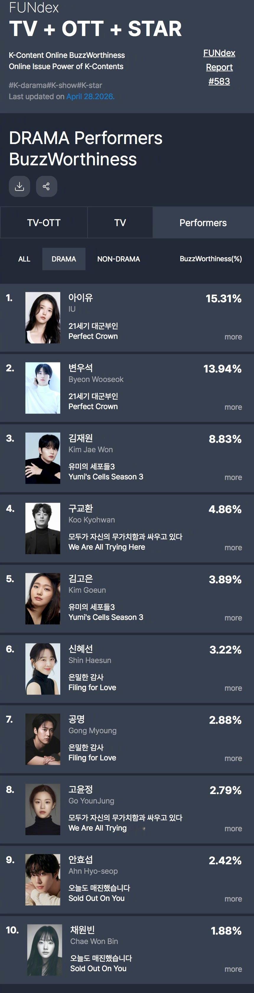 GOODDATA公布2026年4月第4周电视剧出演者话题性排行。1.IU 21世纪大君夫人 15.31%2.边佑锡 21世纪大君夫人 13.94%3.金载原 柔美的细胞君3 8.83%4.具教焕 努力克服自卑的我们5.金高银 柔美的细胞君36.申惠善 秘恋稽核中7.孔明 秘恋稽核中8.高允真 努力克服自卑的我们9.安孝燮 秒杀爱情10.蔡元彬 秒杀爱情